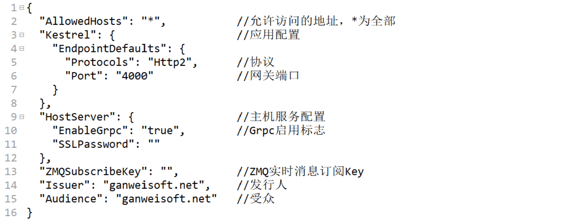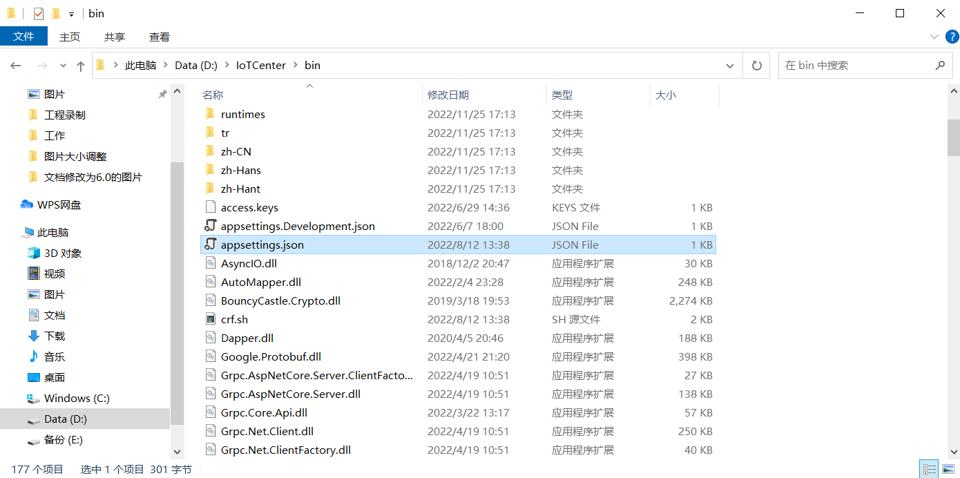 网关配置文件,位于IoTCenter\bin目录中,主要用于配置网关Grpc端口、会话密钥、消息订阅Key等。
