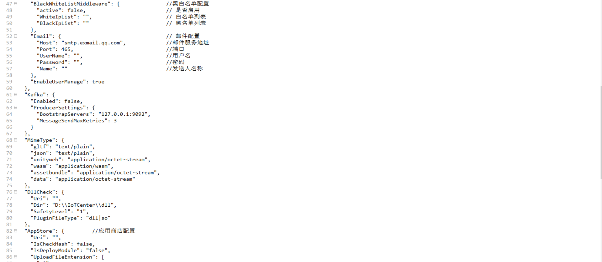 Web配置文件,位于IoTCenter\IoTCenterWeb\publish中,主要用于网关地址配置、网关ZMQ配置、SSL证书配置、WebAPI配置、黑白名单配置邮件配置等。