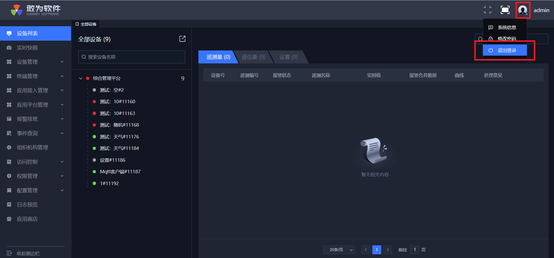 菜单栏支持查看系统运行信息、修改密码、退出登录、收缩导航栏以及全屏浏览。