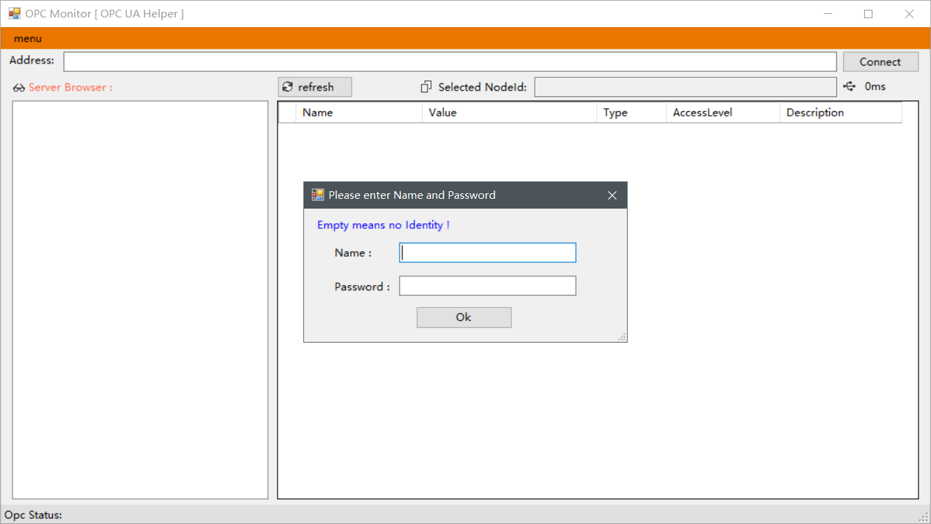 4. 如果 OPC UA server 需要进行身份验证,则输入 IP 端口和 server name->点击 menu->选择 UserIdentity->输入账号跟密码->再点击 Connect链接。