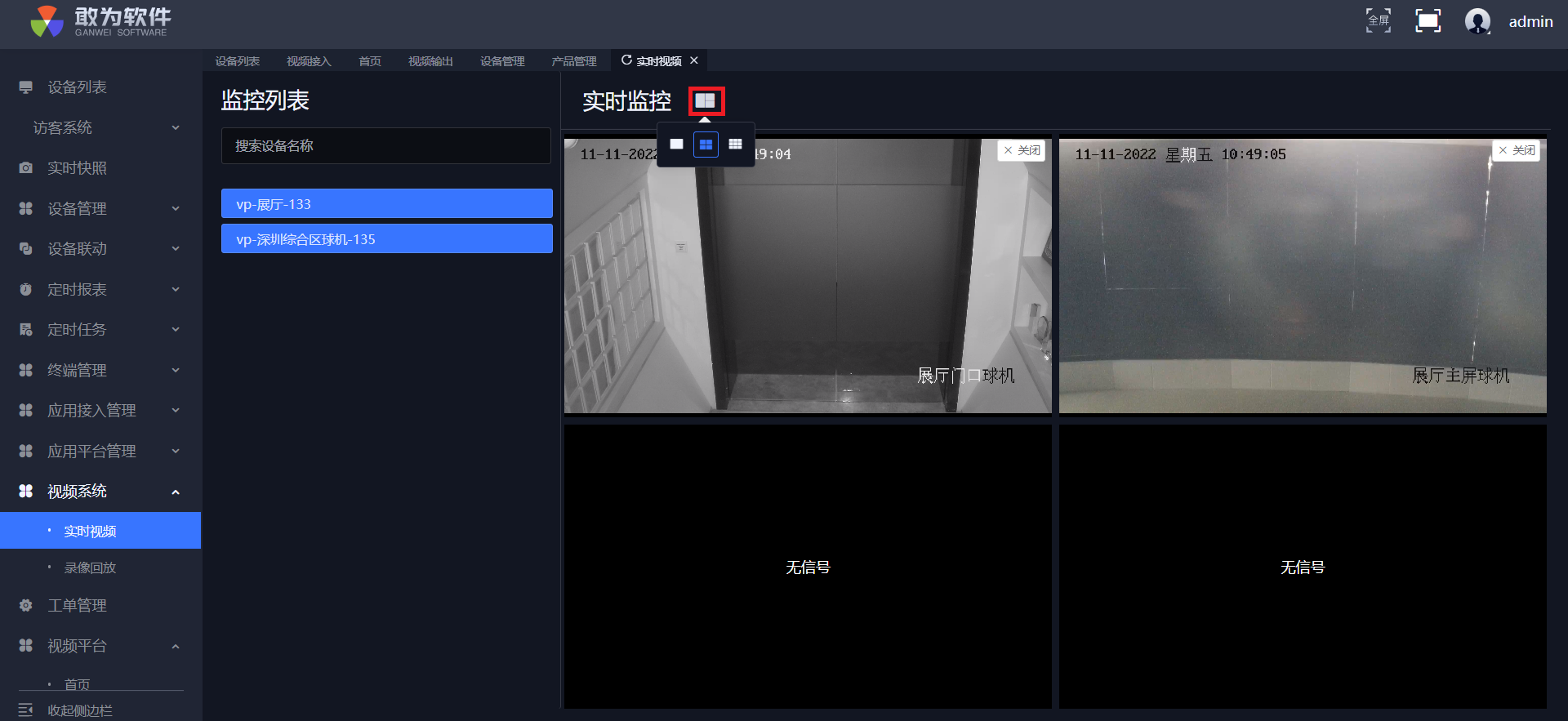 选择视图1/4/9/16/36,即可通过多视图查看实时视频。
