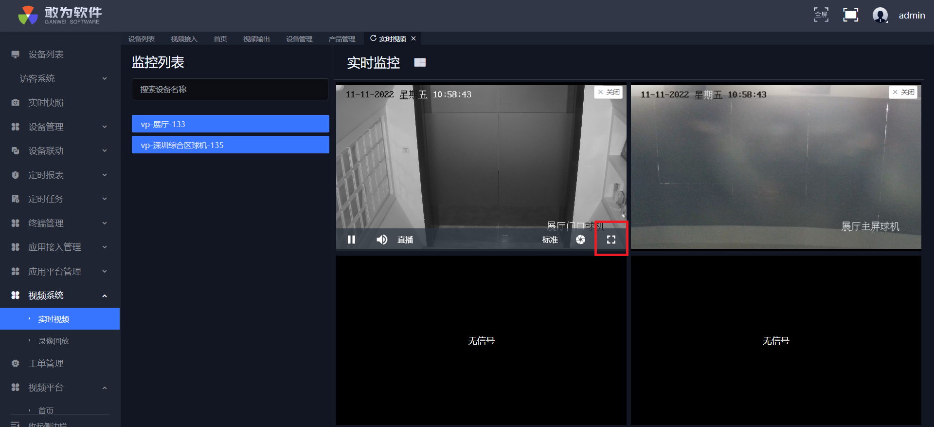 | 2 | 支持查看实时视频 | 选择任一监控,能查看到当前监控的实时视频。 支持查看1/4/9/16/36多个视图查看视频。 支持视频及视图全屏显示。 支持关闭单个或所有视频。 |