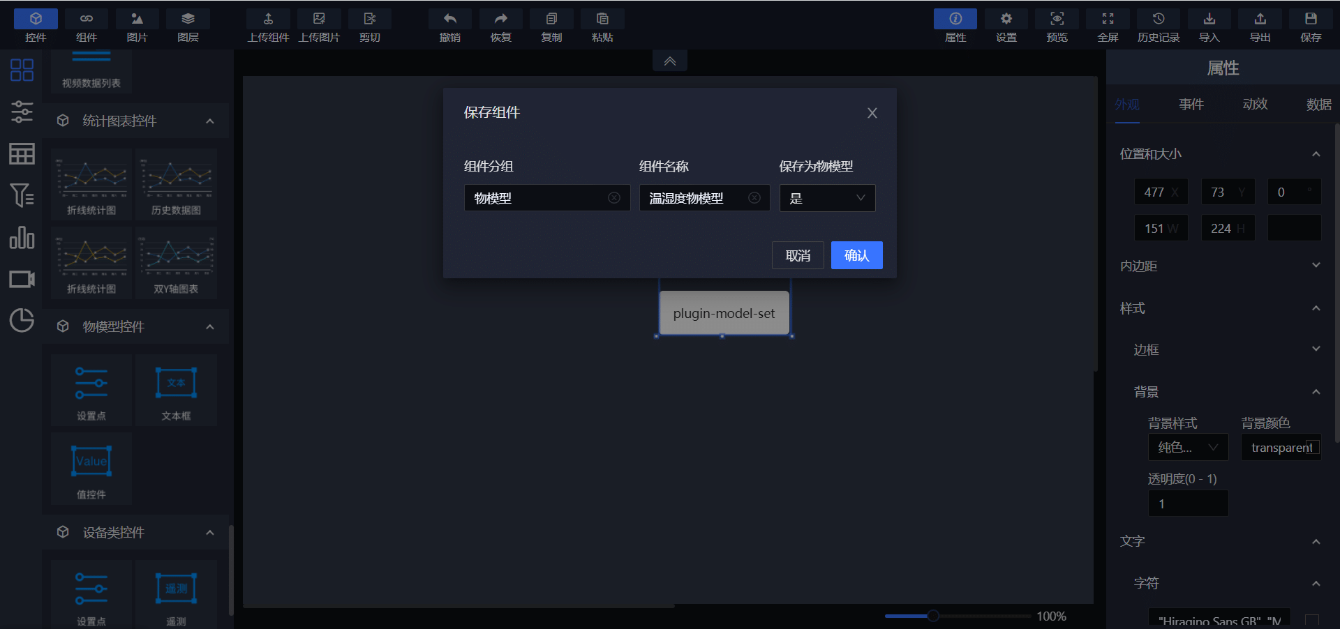 在组件菜单中找到已保存的物模型组件,拖到画布中。单击当前组件,点击右下角的设备绑定。在弹出的页面中选择产品对应的设备,点击绑定。再关闭当前弹框。