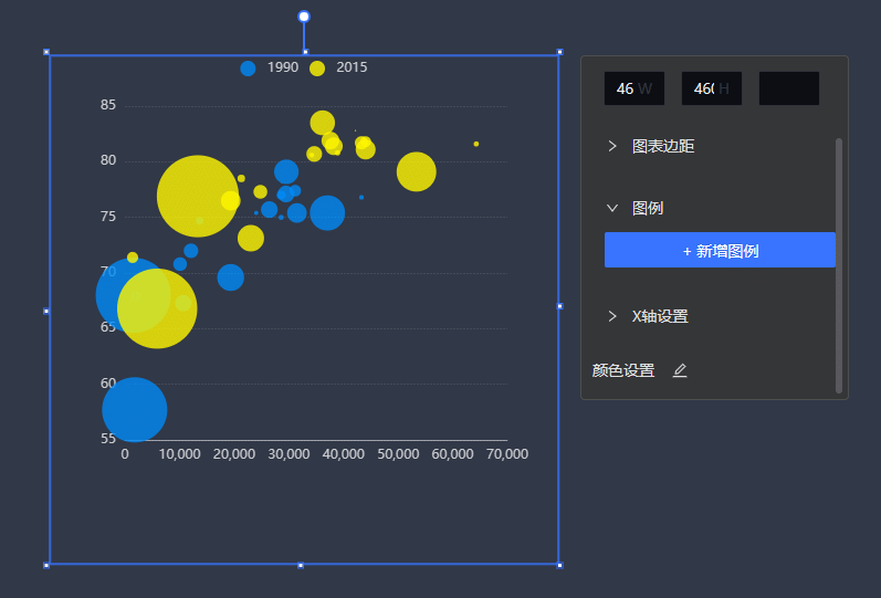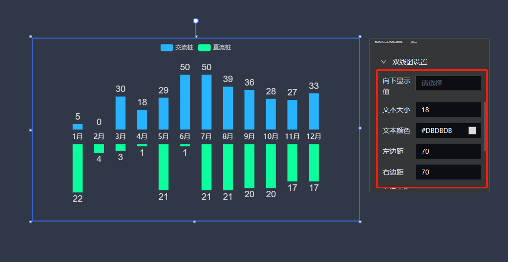 双向图的设置中向下显示值中的值表示的是第几项图例在图表中向下显示(可以选择多项)。左边距,右边距是对图表隔控件外框的距离。