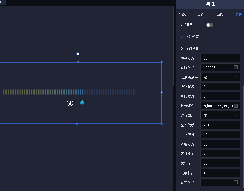 将电量柱状图设置为电量进度条时,新增仅一个图例,将Y轴设置中,同时设置X轴网格线显示和X轴显示隐藏,x,y轴标题字号设为0。其他配置如下: