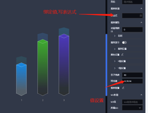 使用3D柱状图时,其值可以通过两种方式进行设置,一种是通过设置表达式绑定设备测点;另一种是通过设置测试值使用固定的模拟值,如下图所示: