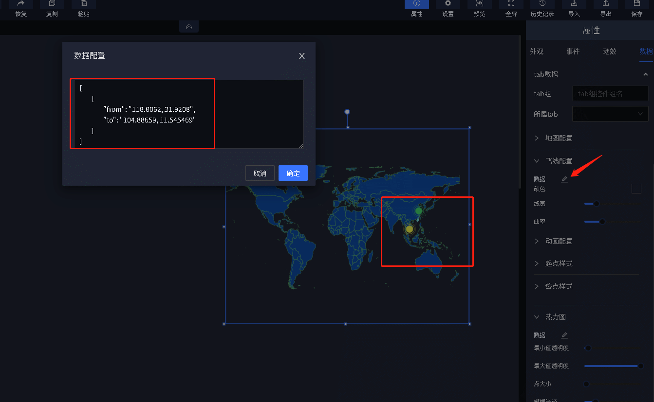 旋转环图的数据配置与百分比饼图一样,其样式配置通过点击属性数据下的配置图标,在弹窗中进行更改。