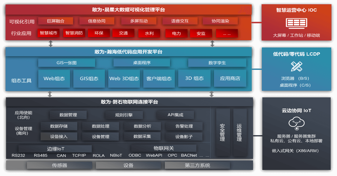 敢为物联网共性平台,提供物联网项目端到端解决方案。在设备端,提供边缘网关,实现在边缘侧设备接入、协议解析以及边缘计算功能;在云端,实现数据中台与业务中台能力,是物联网应用的核心;在应用端,从巨屏、工作站到移动终端全覆盖,实现物联网应用场景的态势感知、运行监测、决策支持、事件管理及应急指挥功能。