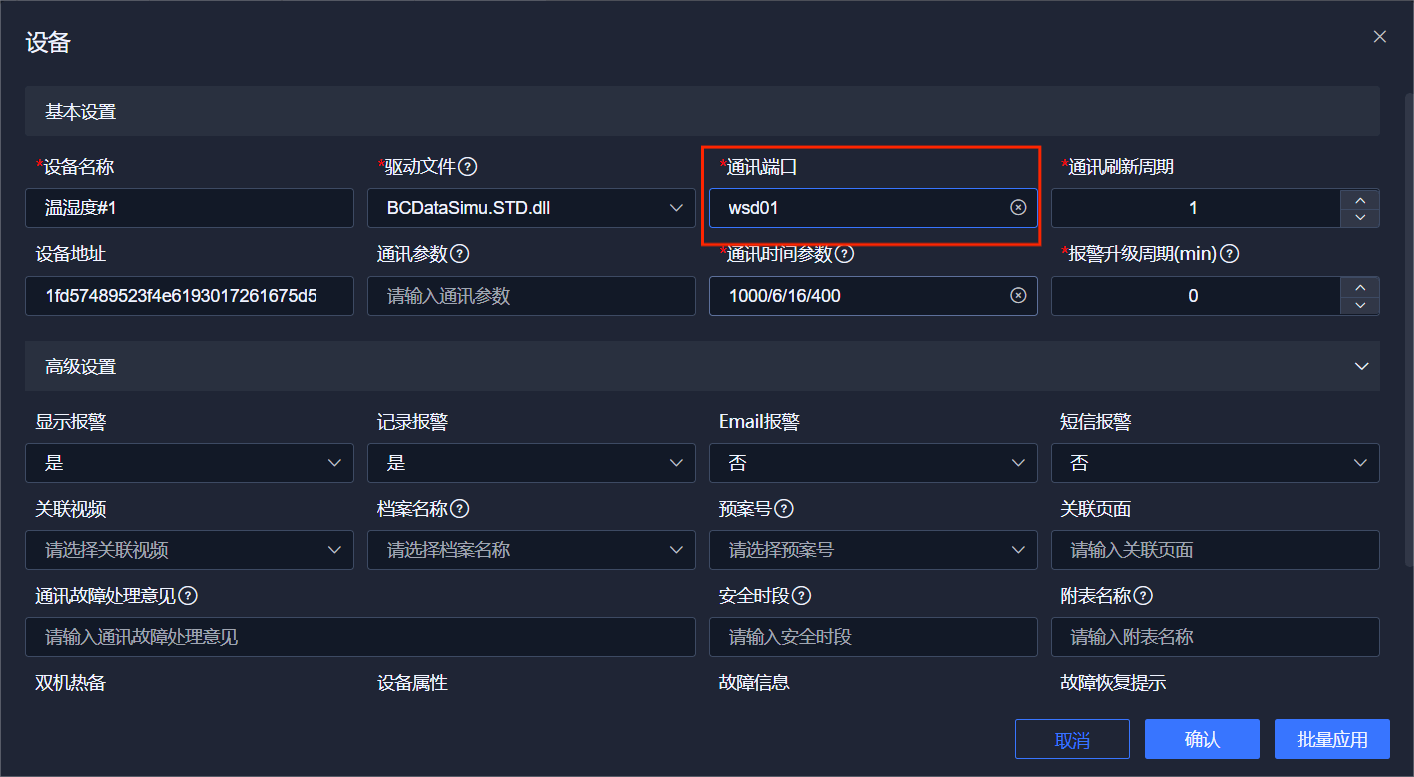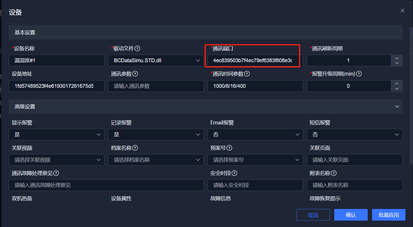 打开设备配置,会发现100个温湿度设备的“通讯端口(对应数据库local_addr字段)”的值都一样均为“4ec839503b7f4ec79ef6383f808e3c24”,如下图所示: