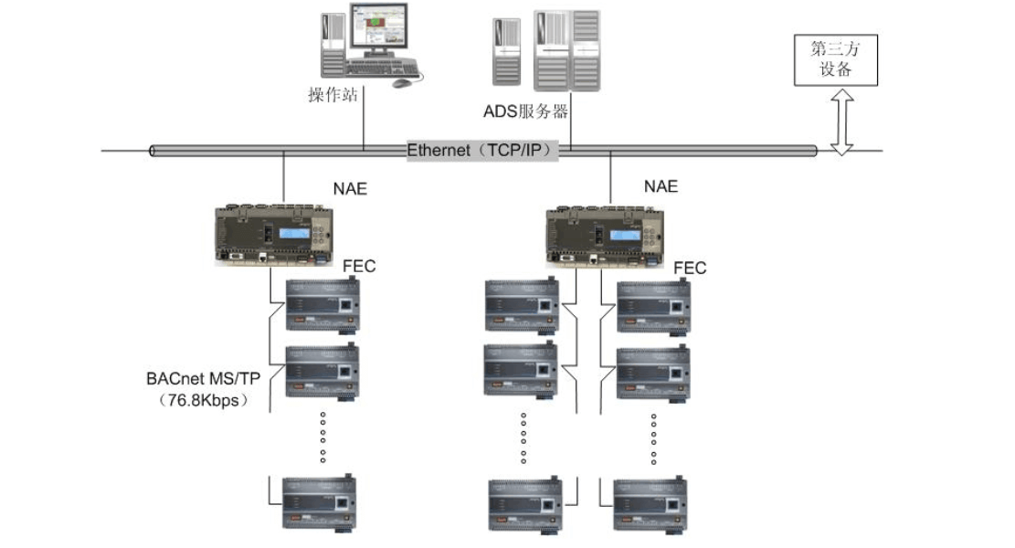 上图整个系统架构中MSEA系统采用分布式集散控制方式,系统的网络结构分为两层:控制层和管理层;NAE 与 NAE 之间的通讯层为管理层,NAE 与 FEC 之间的通讯层为控制层;NAE 设备采用标准 BACnet 主从/令牌传递(MS/TP)协议。