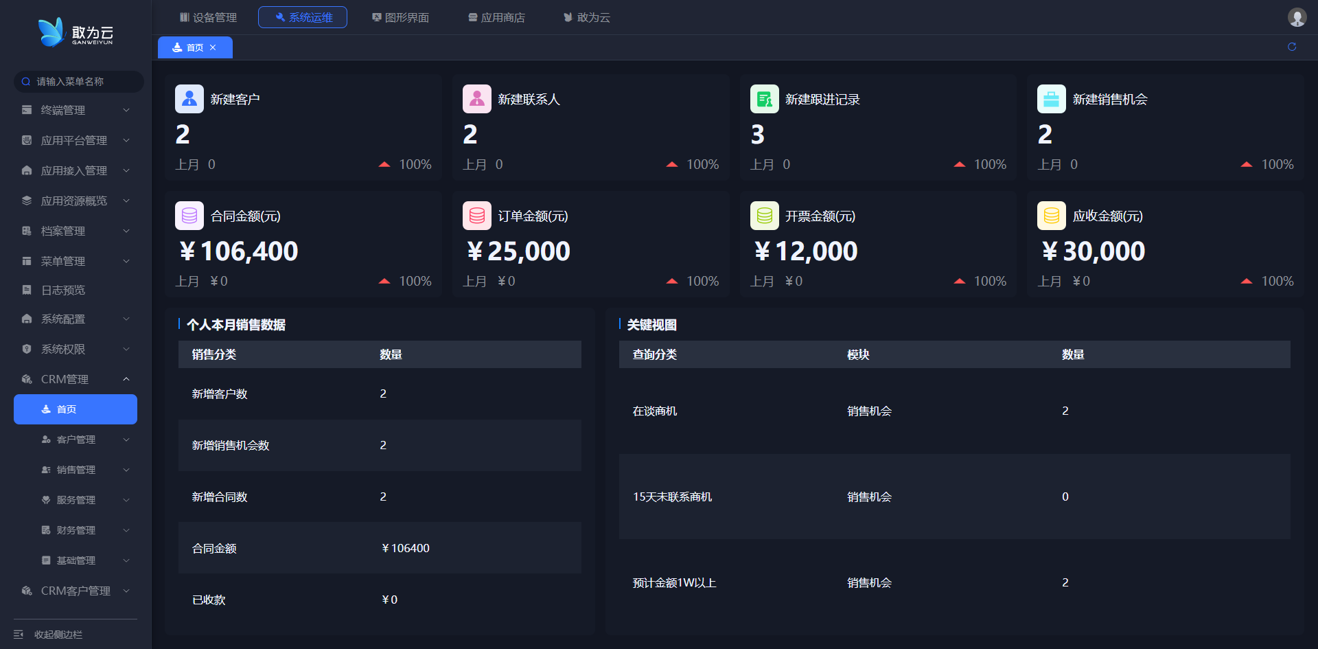首页是CRM系统的核心数据看板,集中展示了包括新增客户、跟进记录、销售机会在内的关键业务指标趋势与上月对比,并汇总了个人本月销售业绩数据(如客户数、合同金额等),帮助销售人员快速掌握业务全局并聚焦工作重点