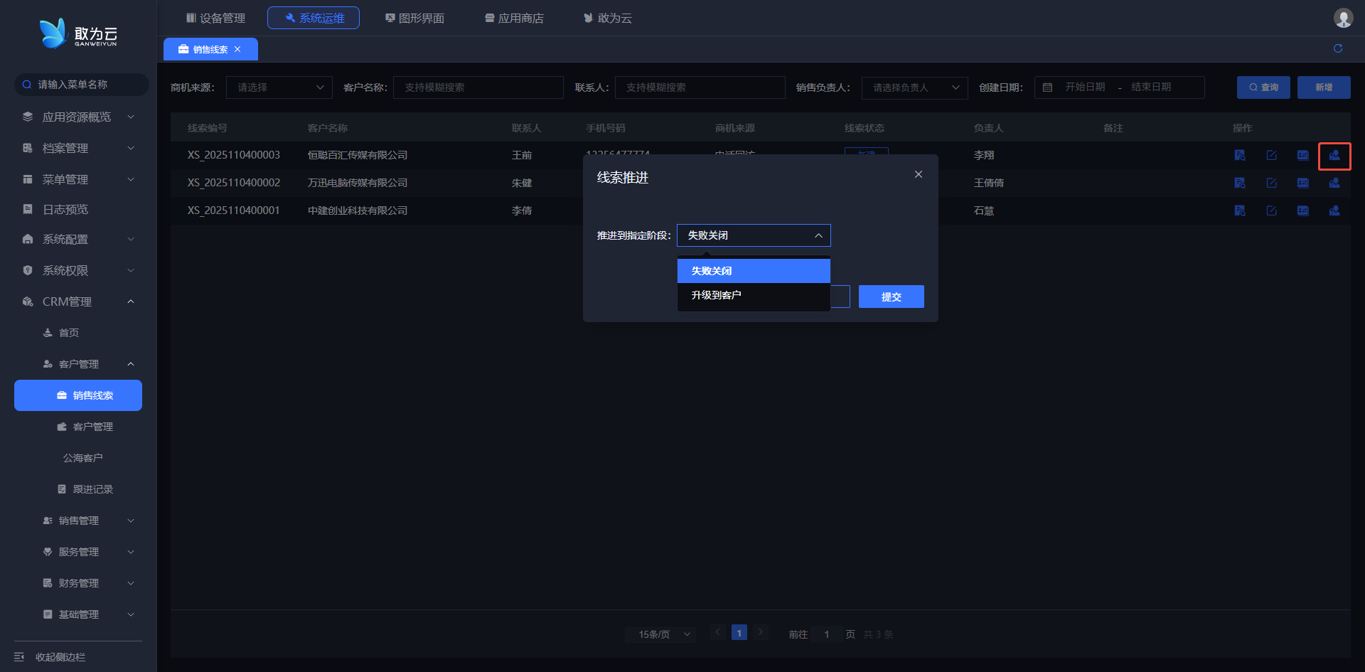 - 在 「销售线索」 列表中找到需要推进的线索记录;