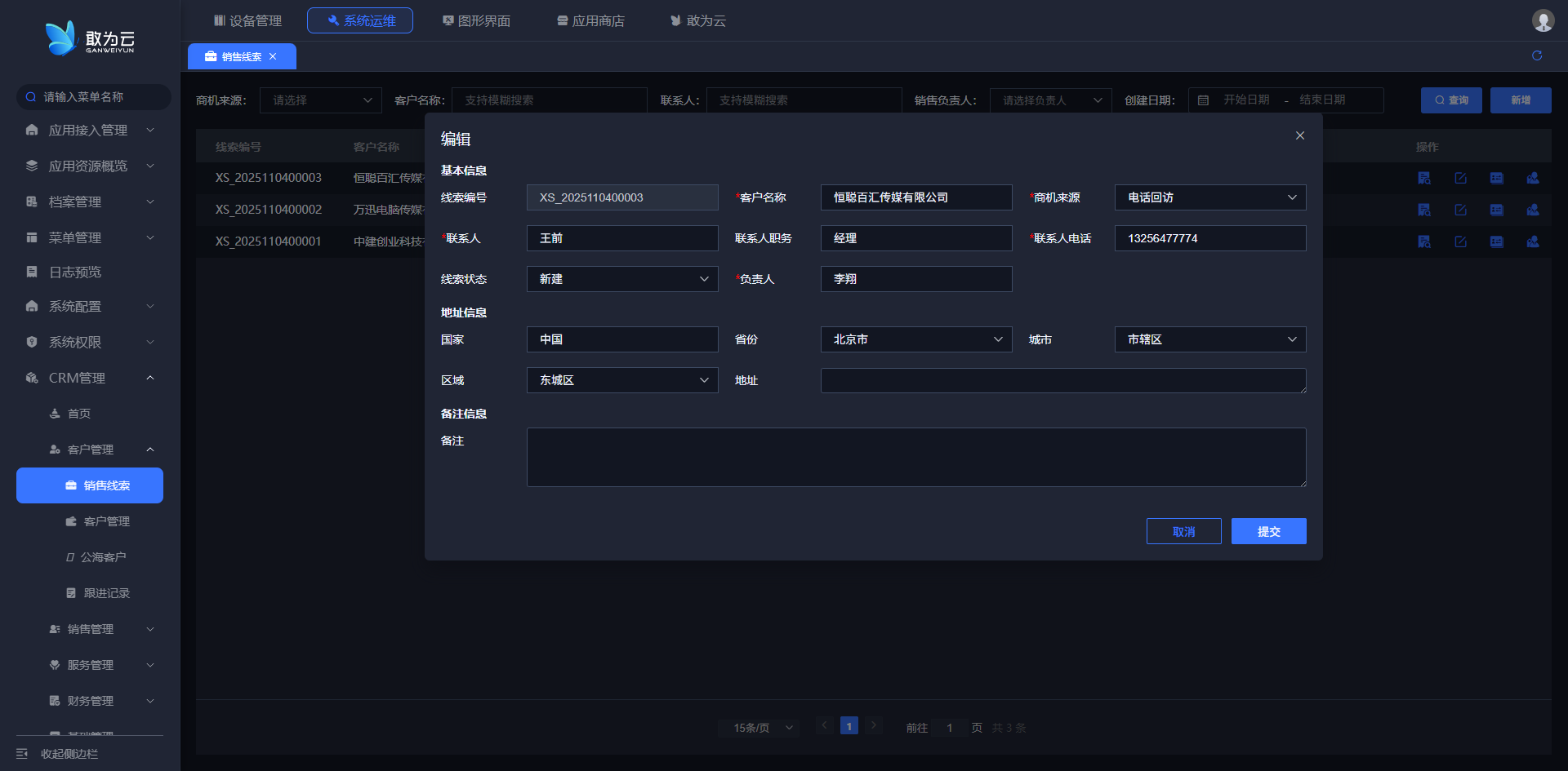 - 在 「销售线索」 列表中找到需要修改的线索记录;