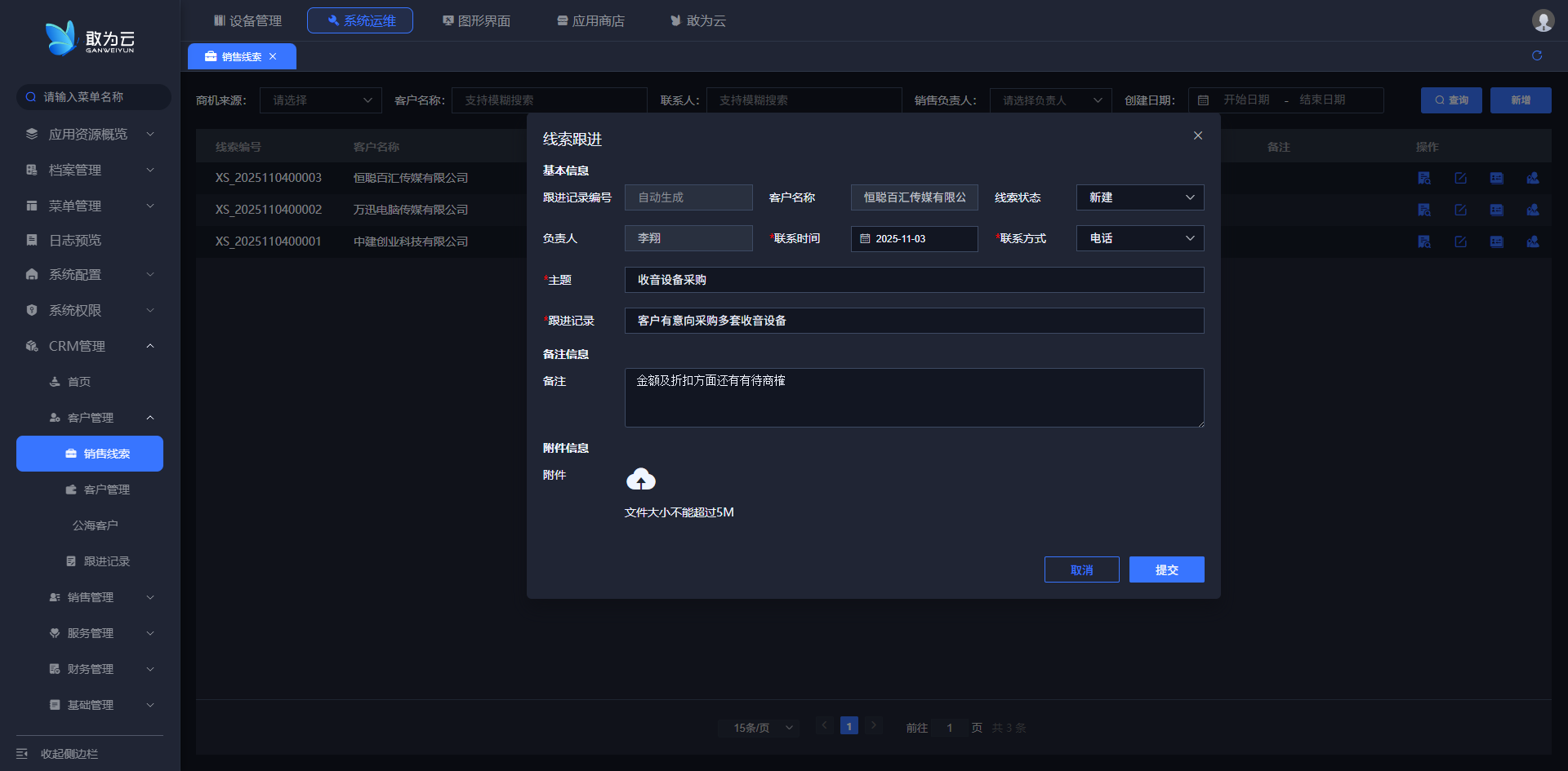 - 系统会弹出线索跟进信息填写界面;