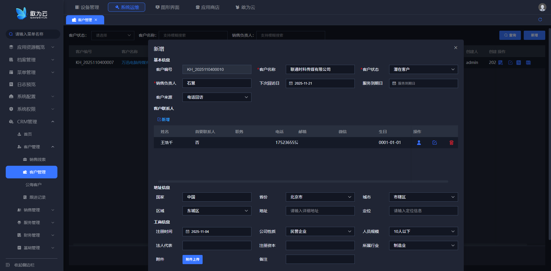 - 点击列表上方的 「新增」 按钮,弹出客户信息创建表单;