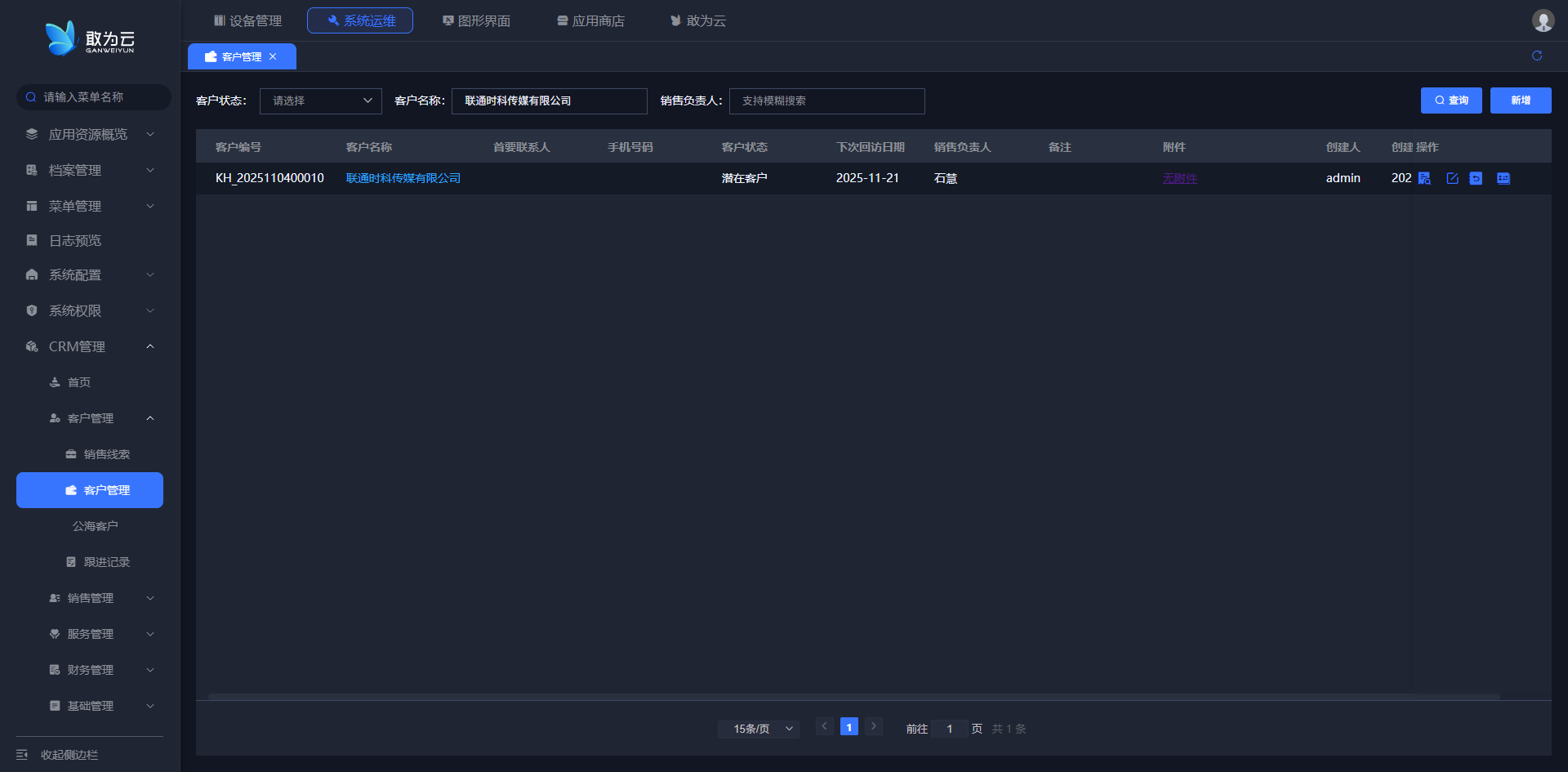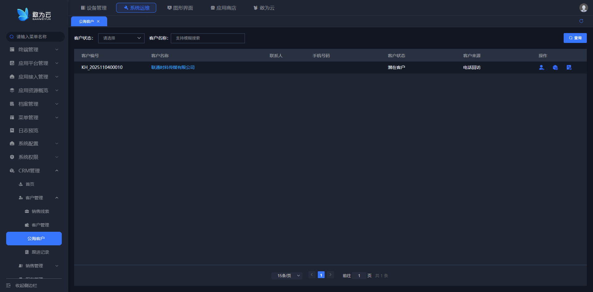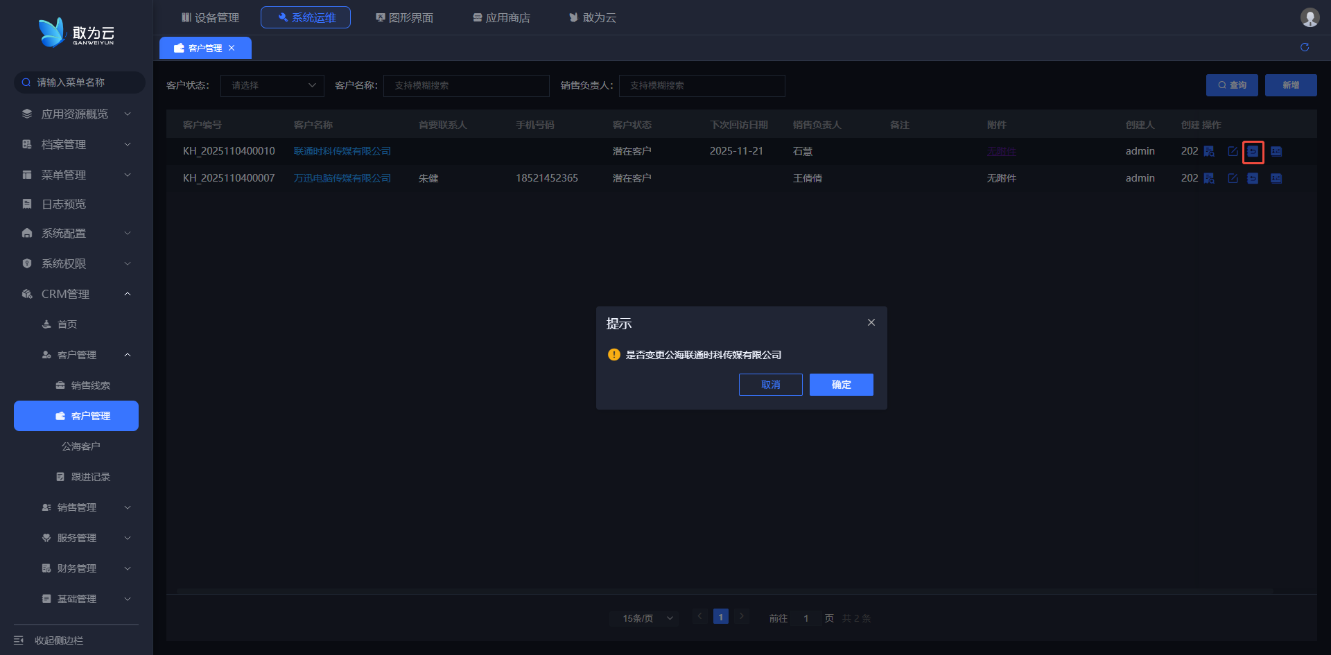 - 在 「客户管理」 列表中找到需要变更公海客户的客户记录;