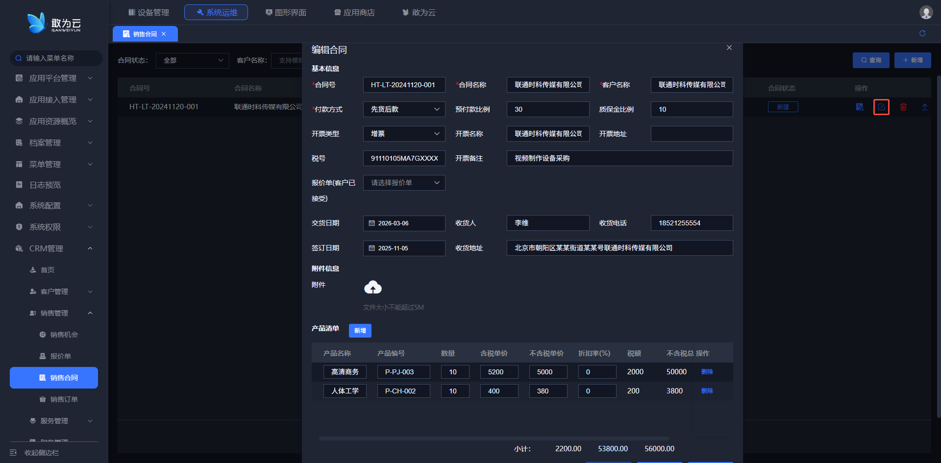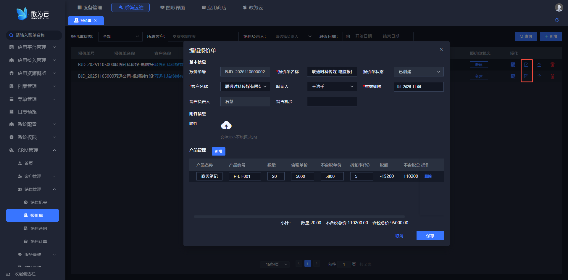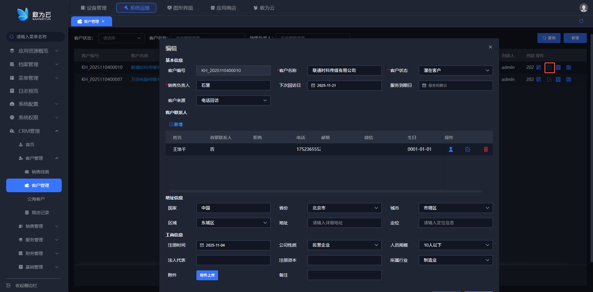 - 点击该记录行右侧的 「编辑」 按钮,系统将弹出客户信息编辑表单;