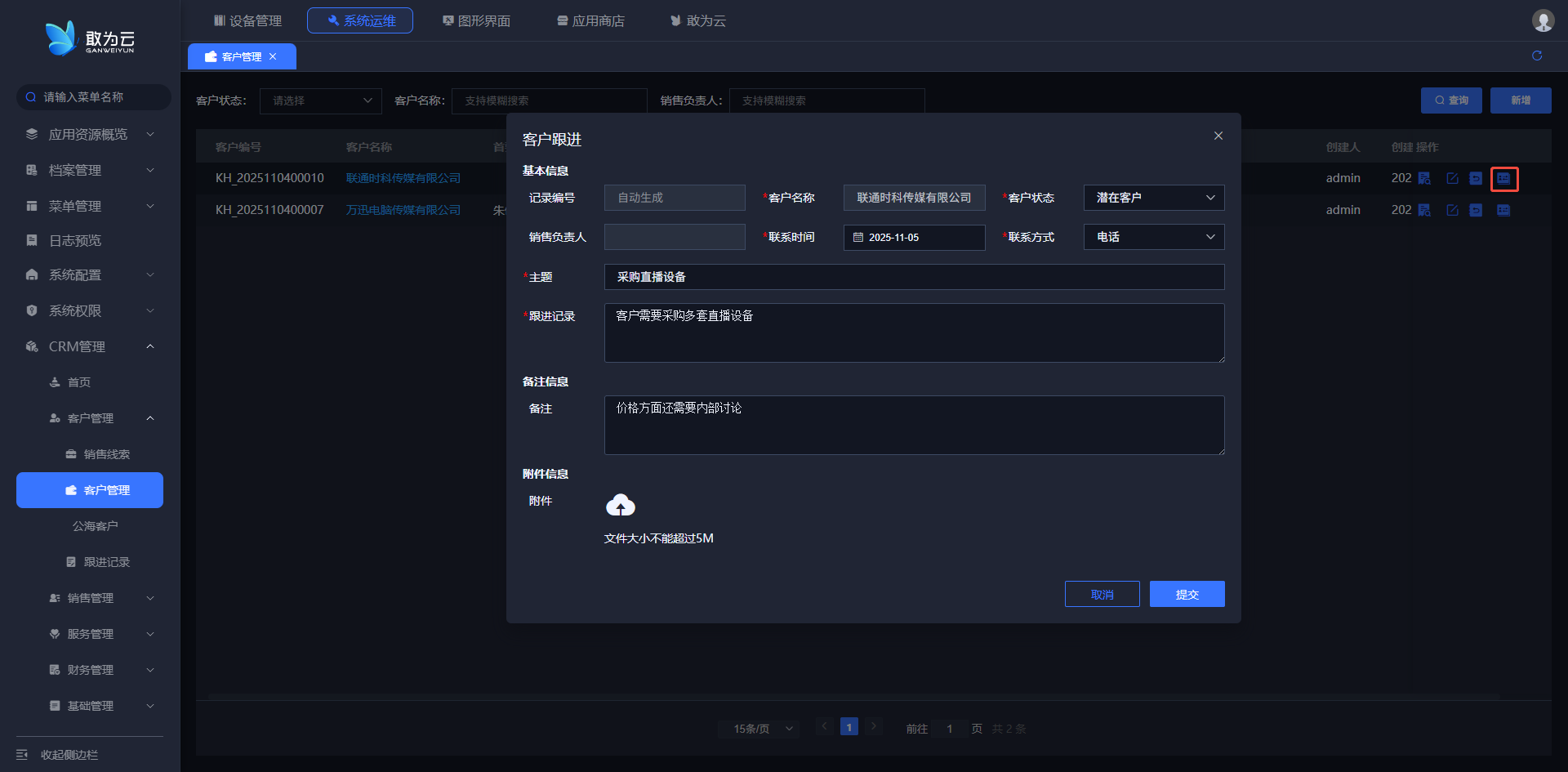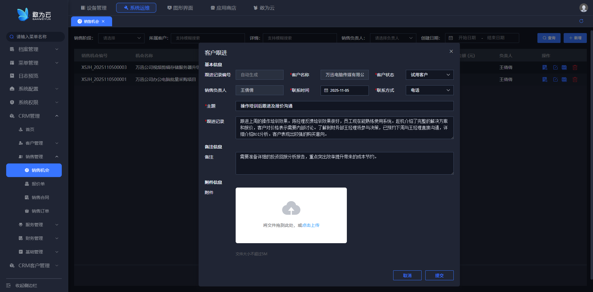 - 系统会弹出客户跟进信息填写表单。