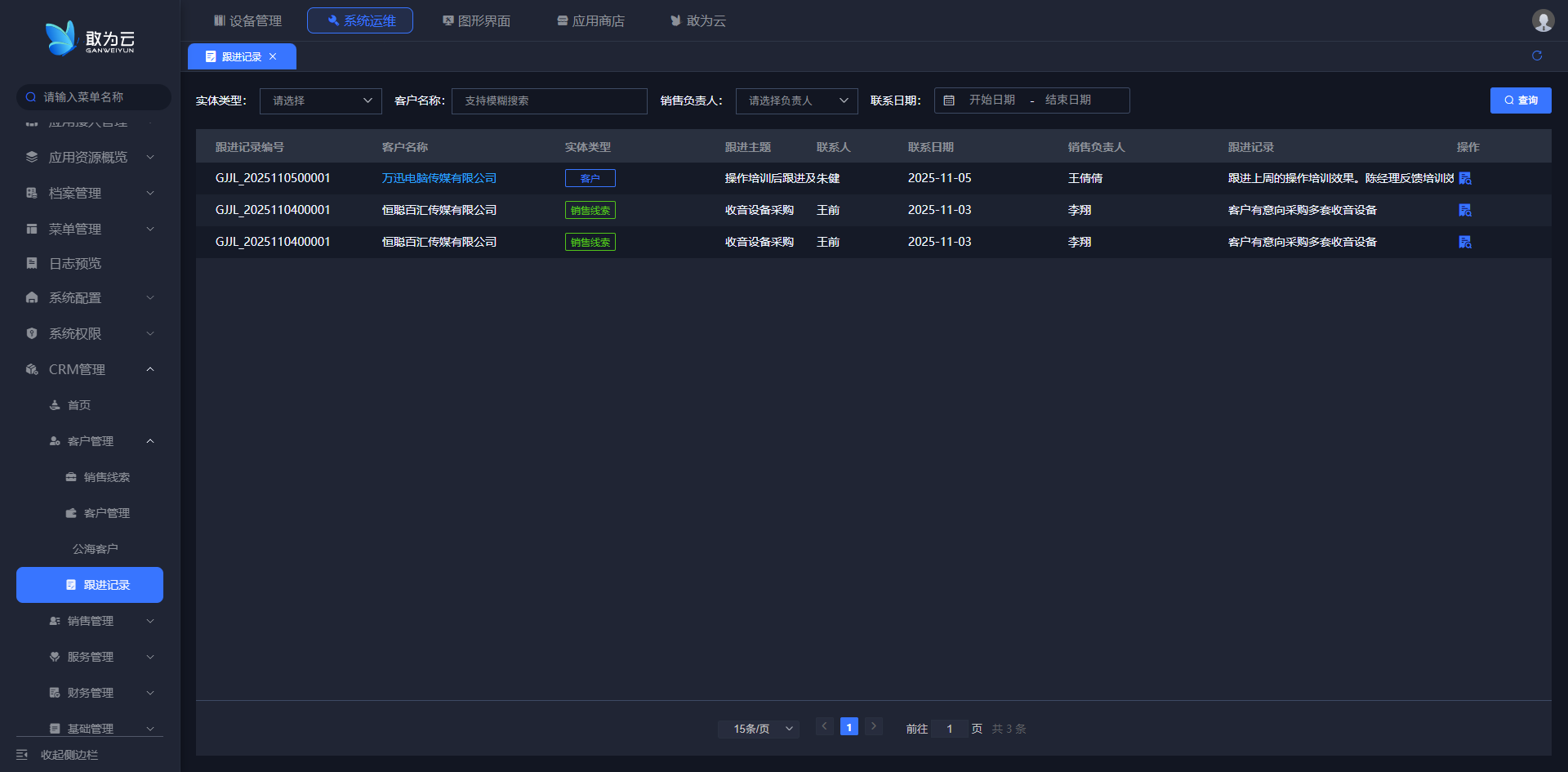 - 在 **「客户管理」**列表中找到需要跟进的客户记录;