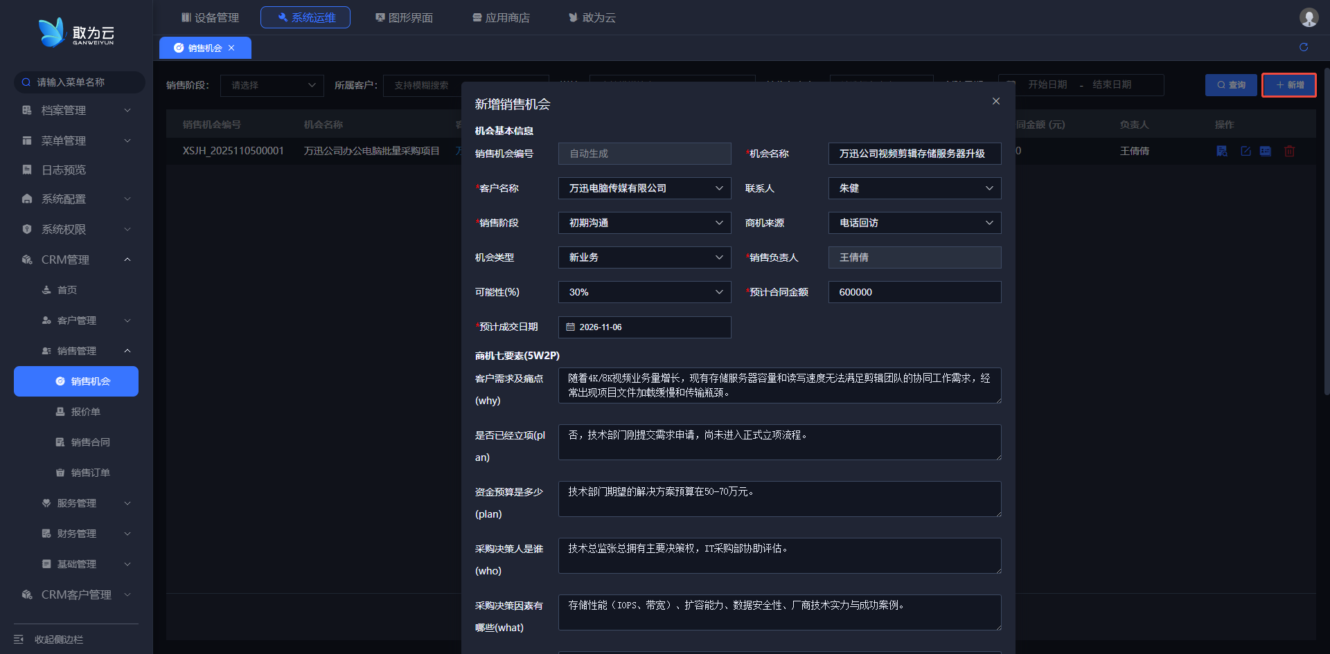 | 6 | 销售机会 | 管理由线索转化的销售商机,跟踪商机阶段、预估金额、赢单概率及推进过程。 |