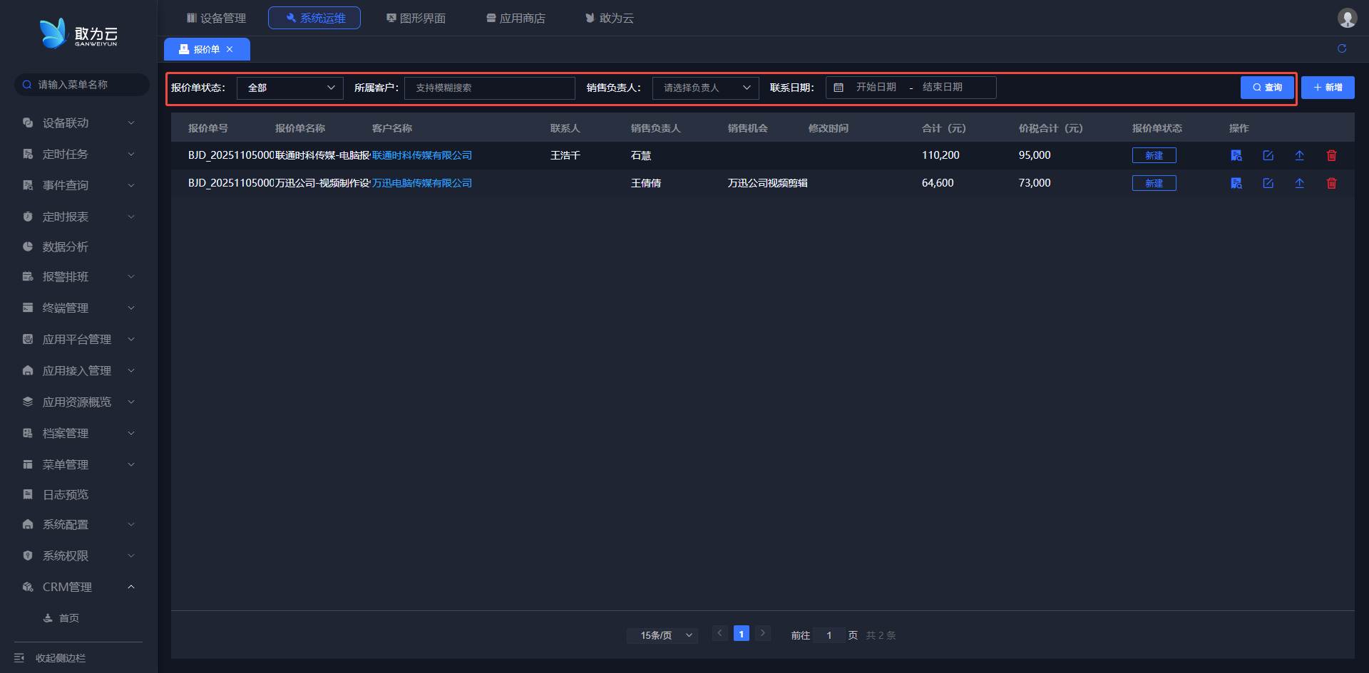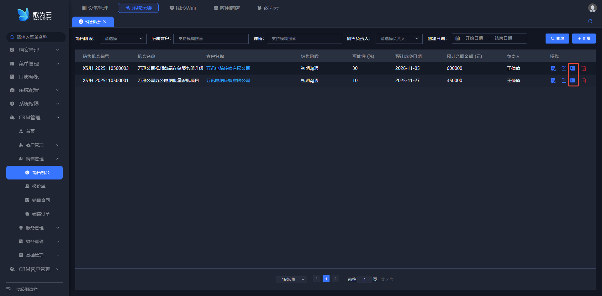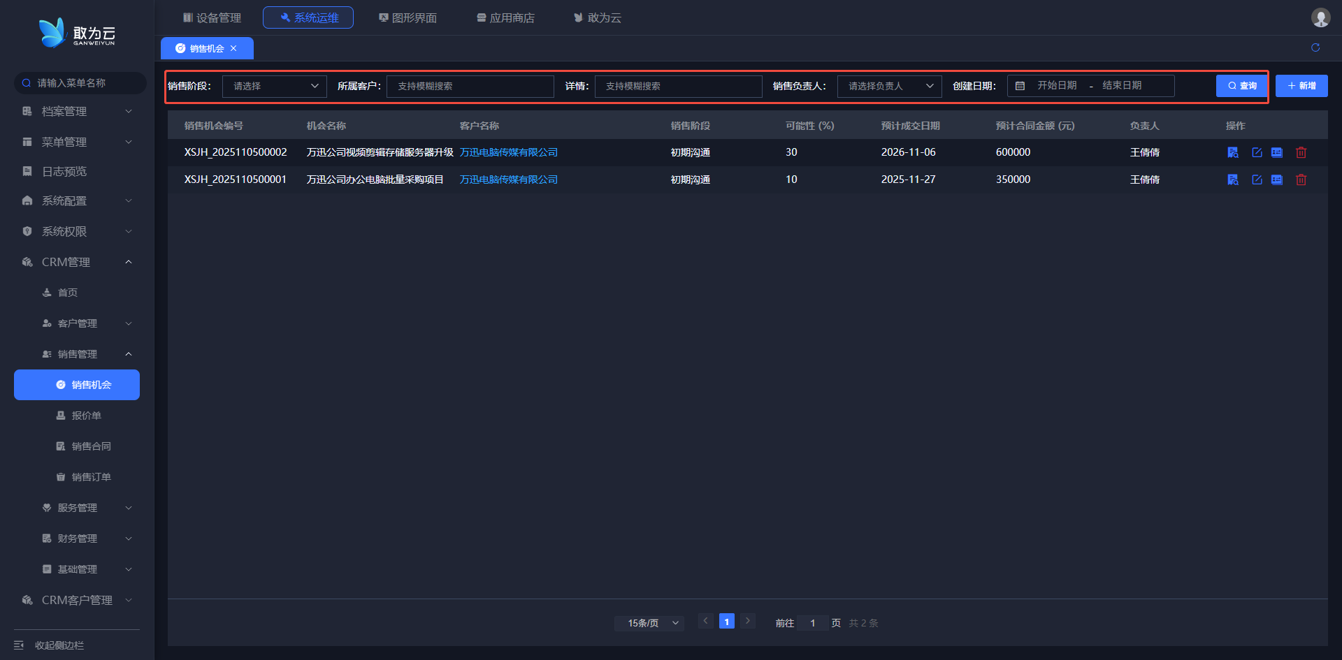 - 您可以根据 客户名称、销售负责人、来源等关键字或条件进行查询;