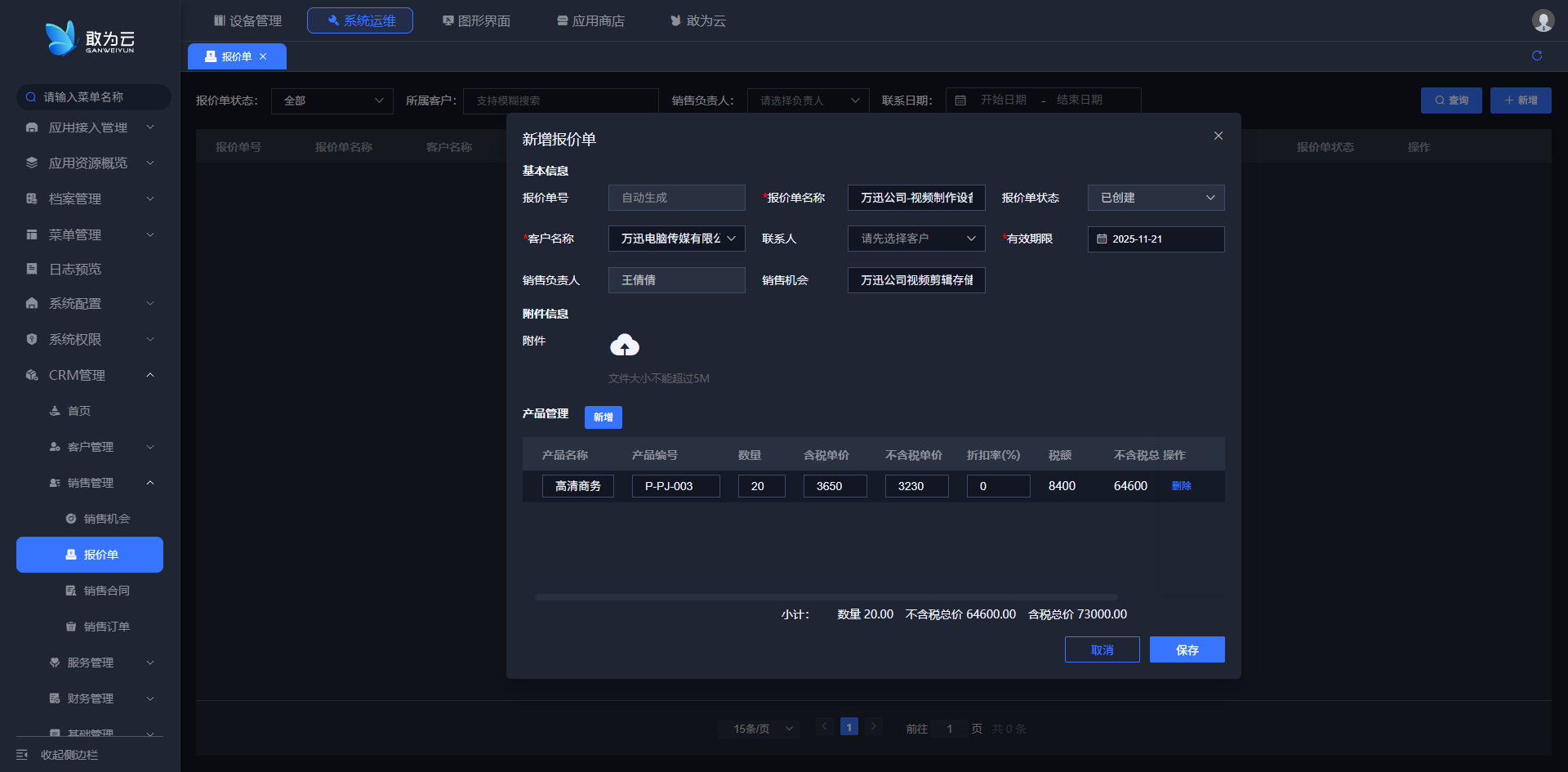 | 7 | 报价单 | 管理与销售机会关联的报价单,支持报价的创建、审批、发送及状态跟踪。 |
