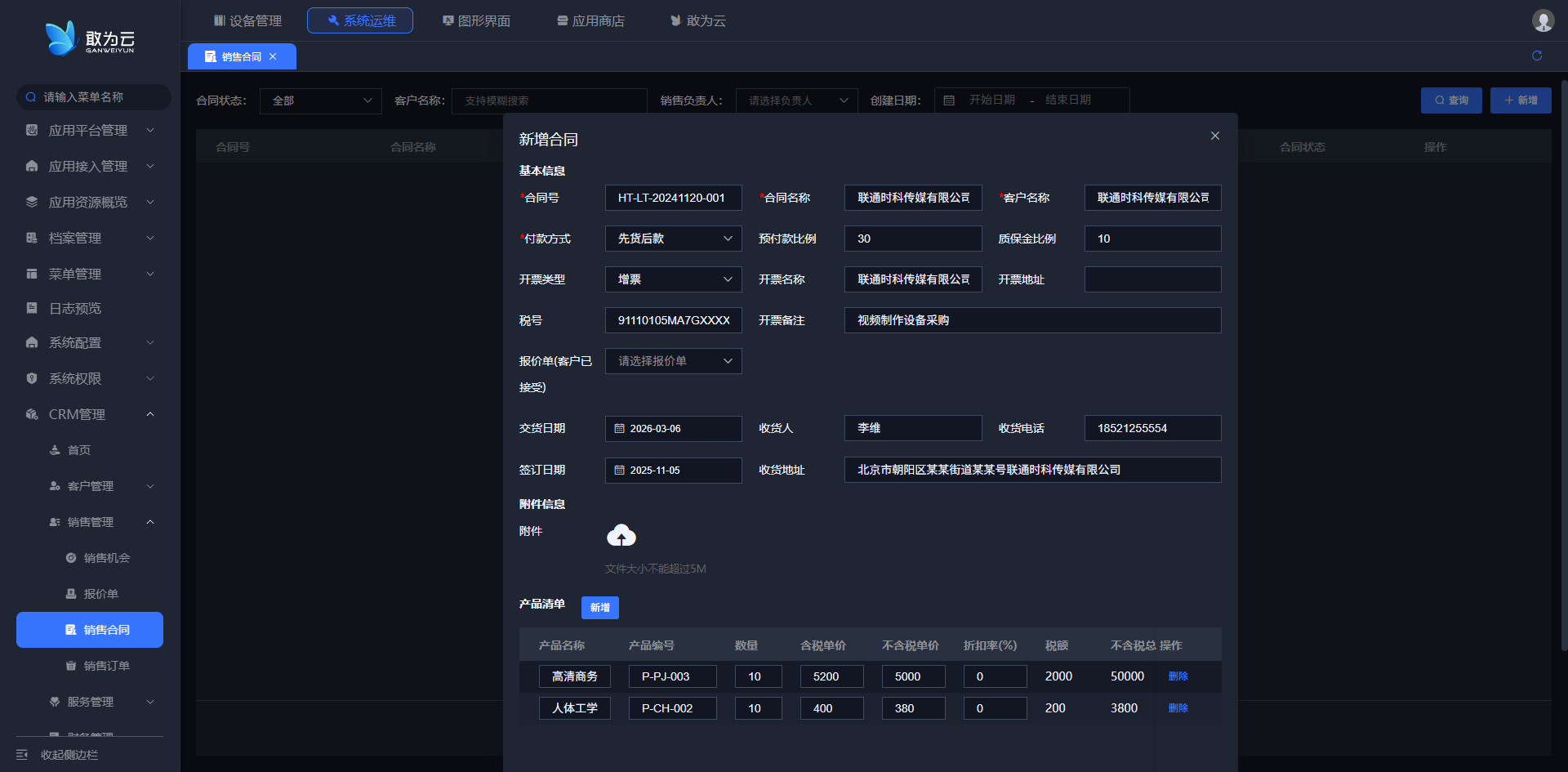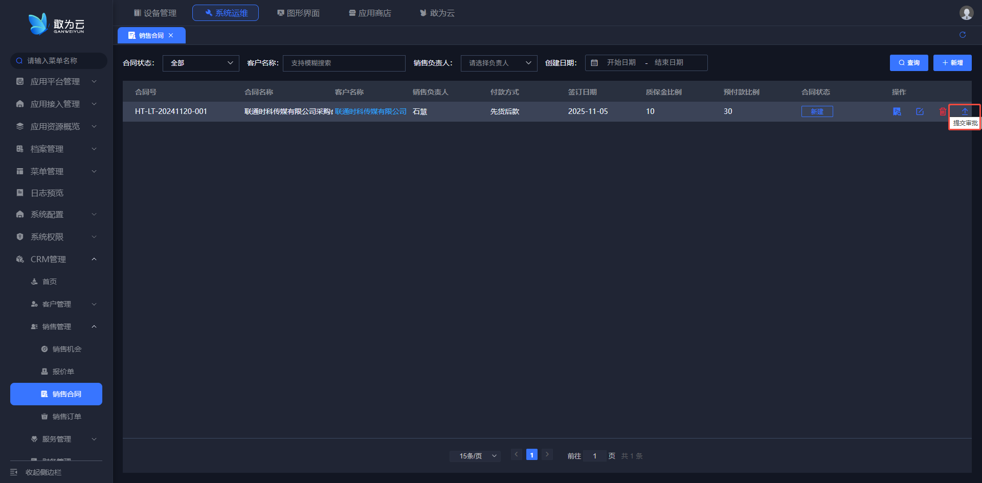 客户名称、销售名称或合同号进行快速搜索。