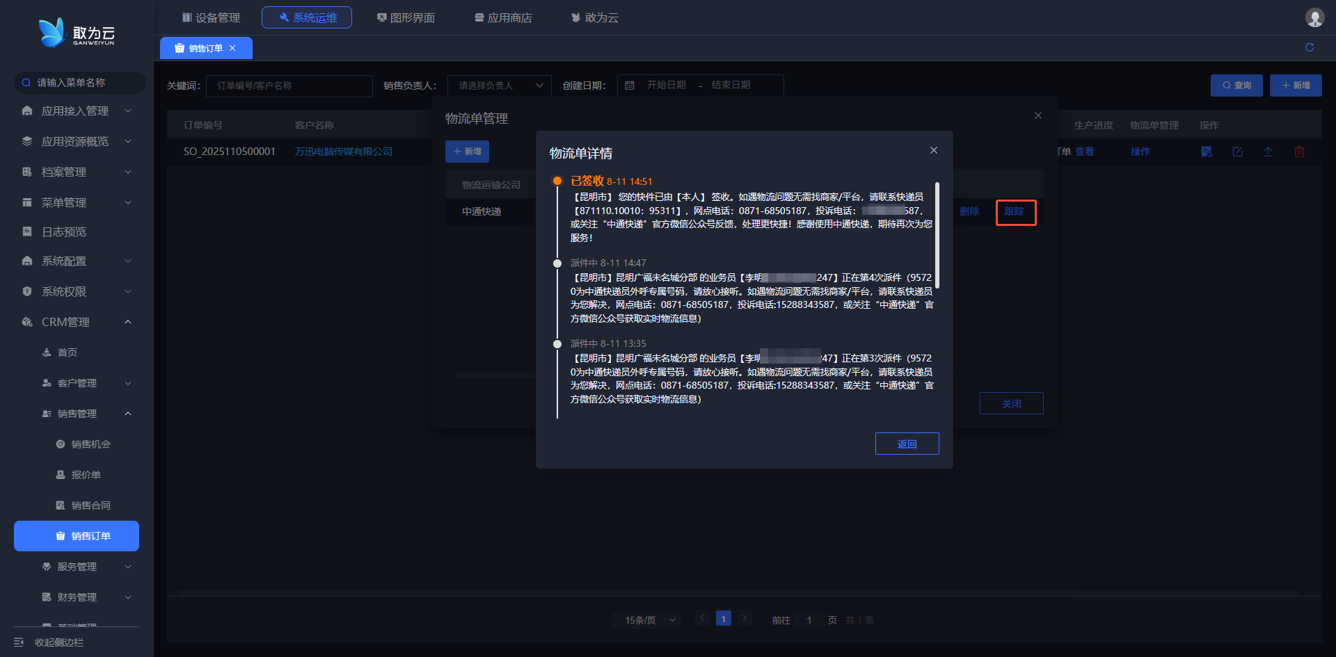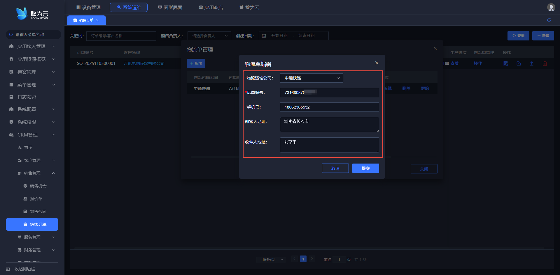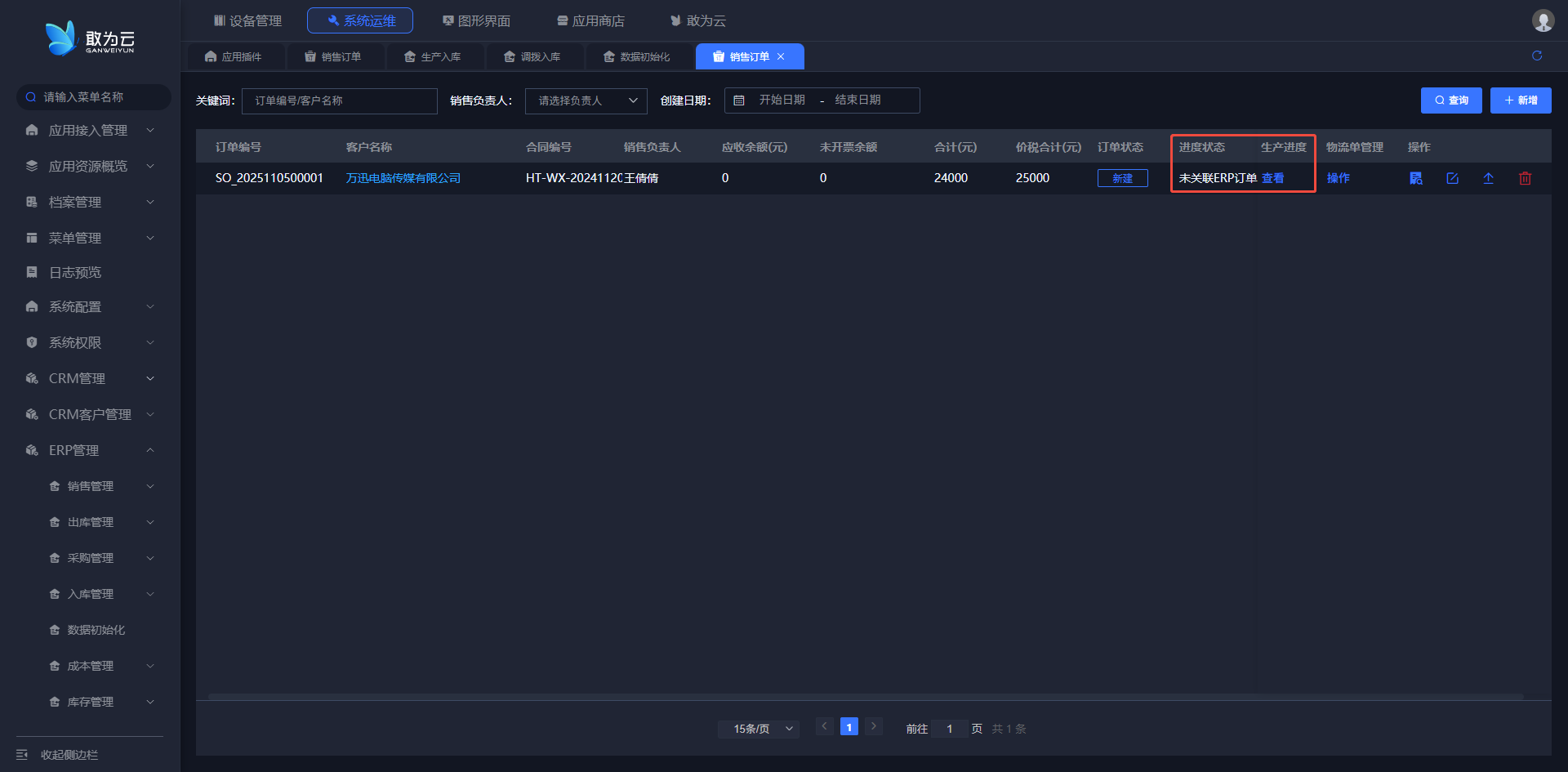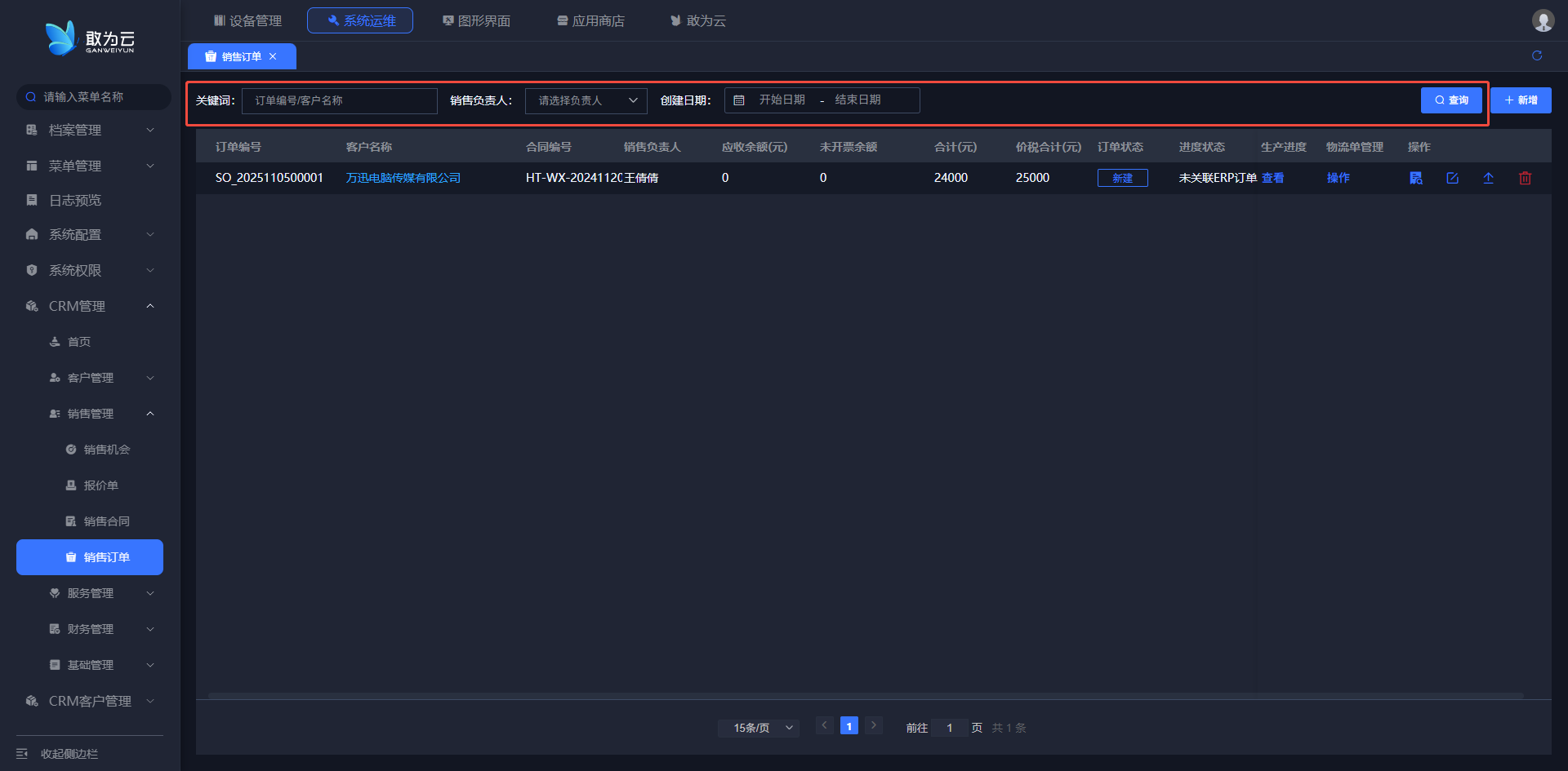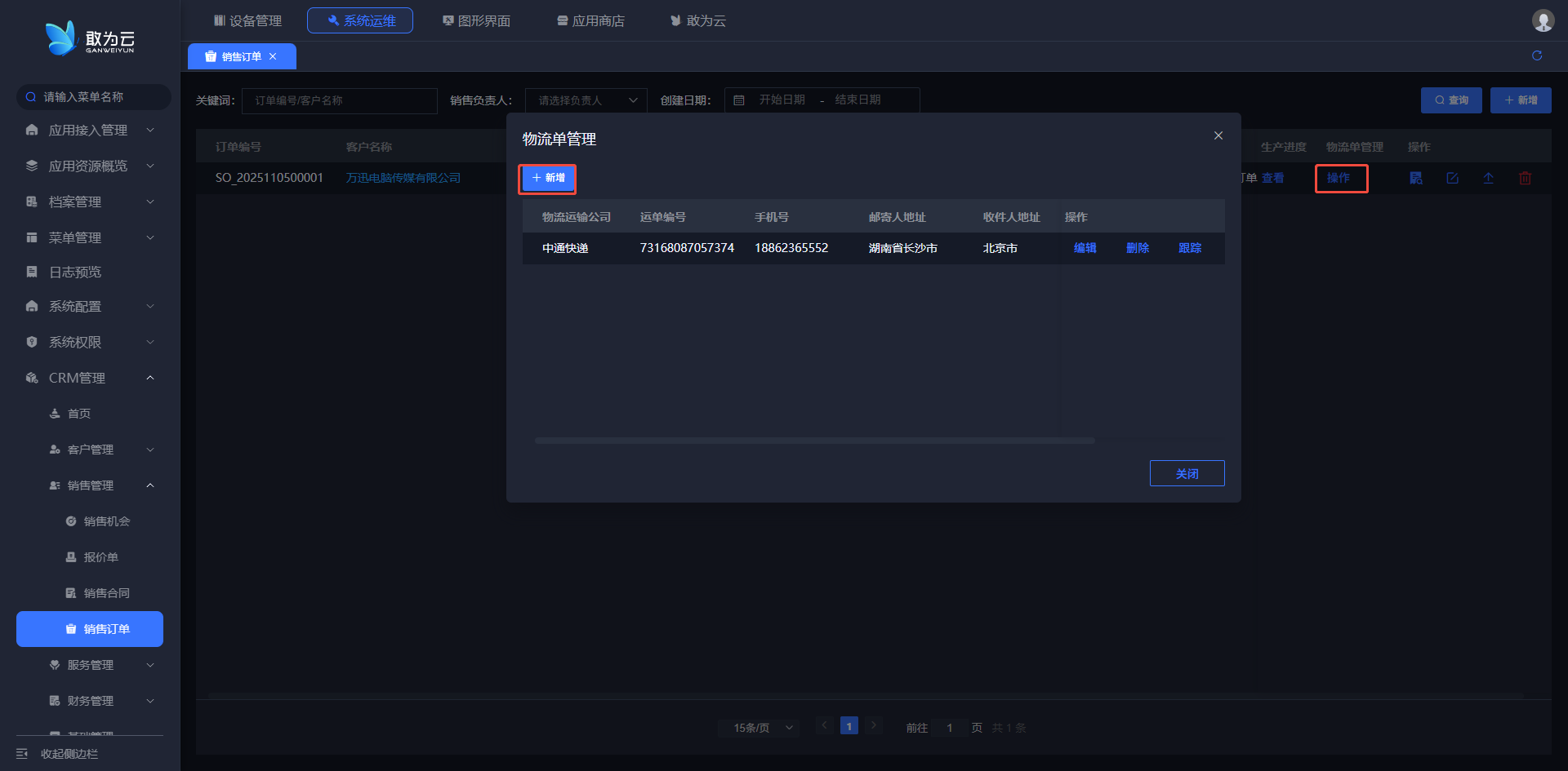 - 在 「销售订单」 列表中找到需要添加物流单的订单记录;