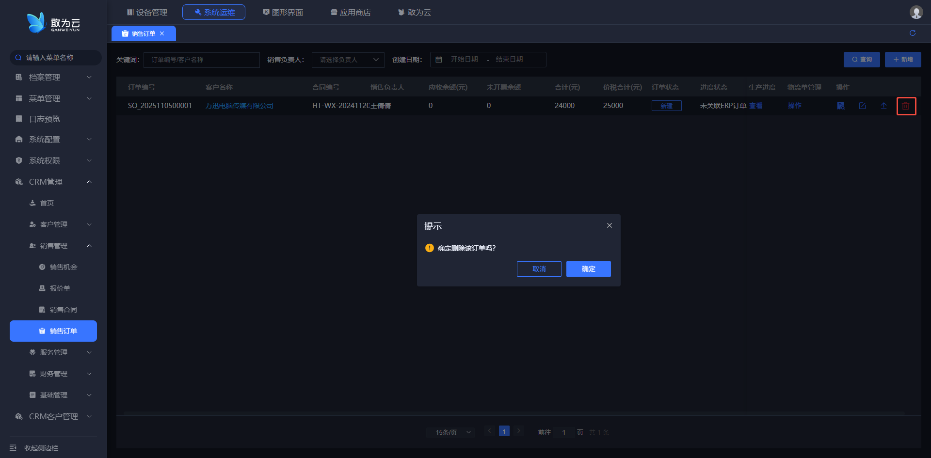 - 确认后,该订单记录将被删除或移至回收站。