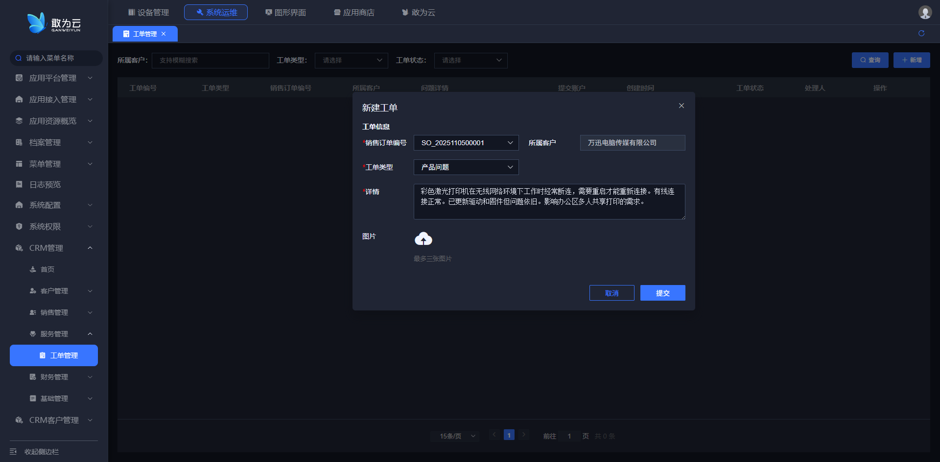 - 点击 「新建工单」或「新增」 按钮,打开工单创建表单;