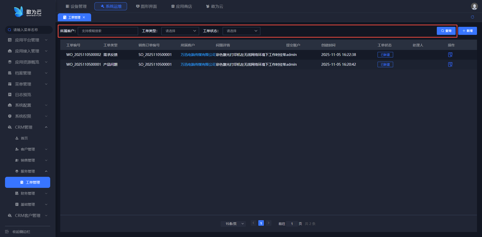 - 支持通过所属客户、工单类型等关键词或条件进行搜索;