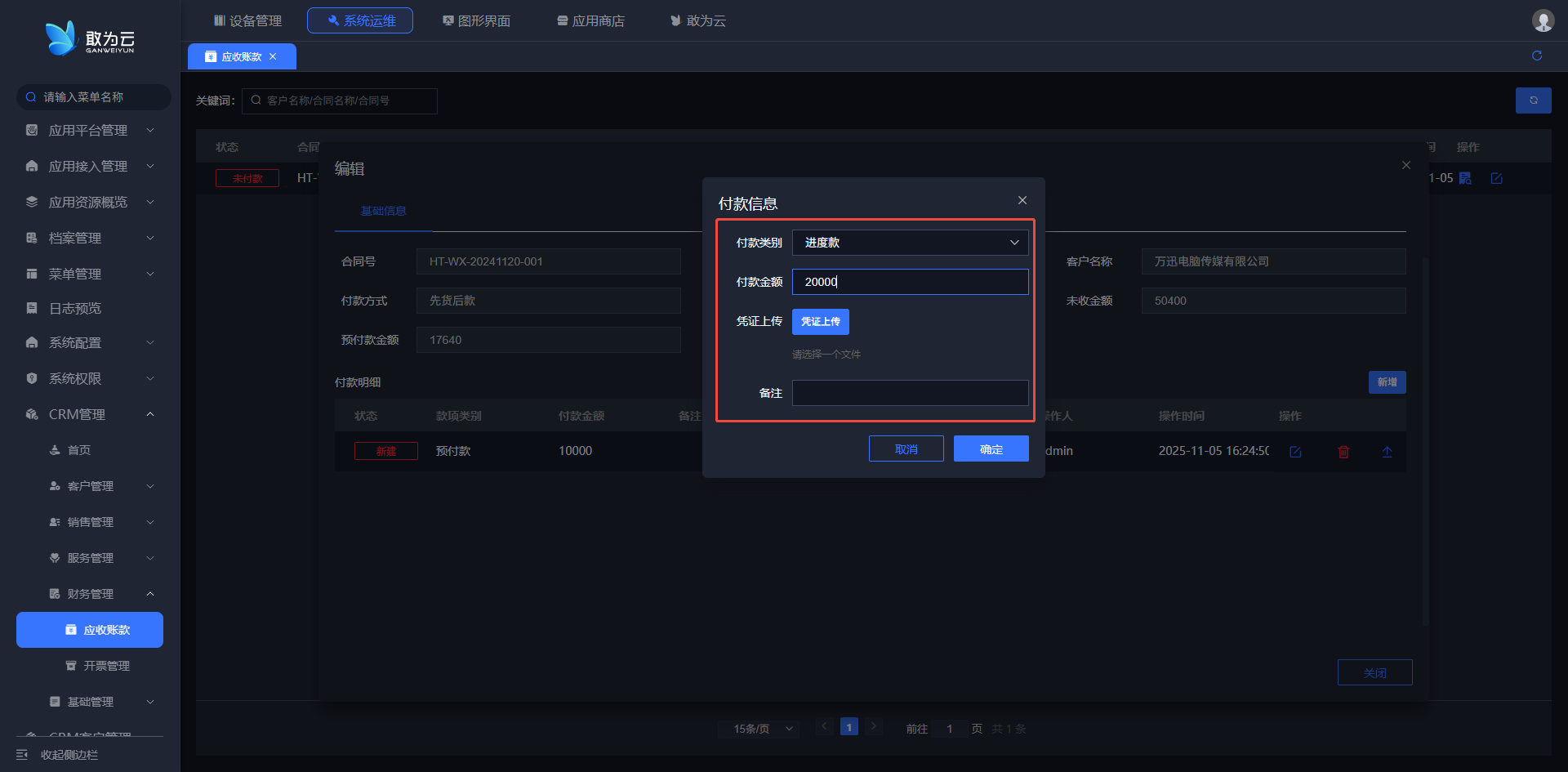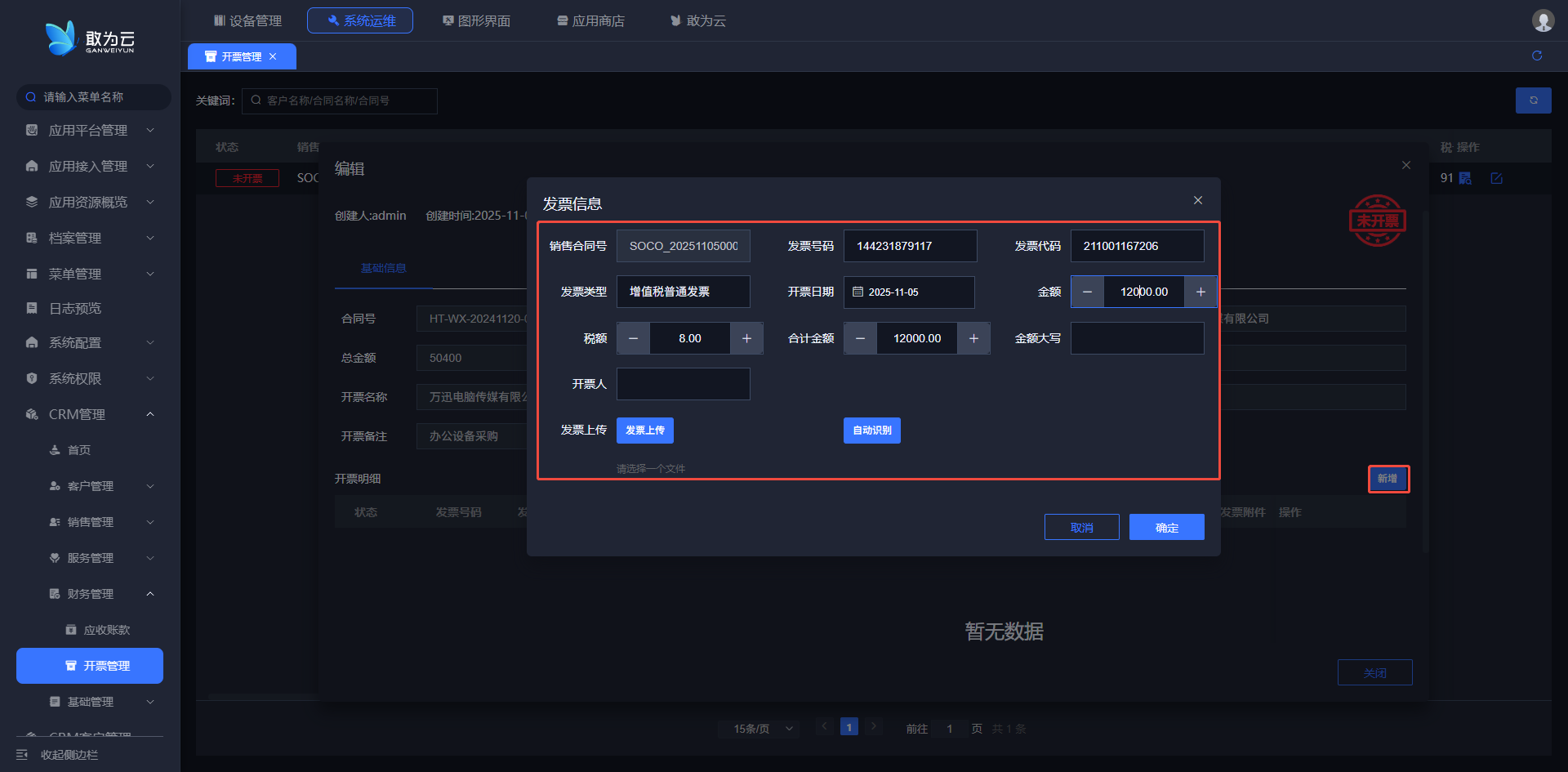 会员号、会员名称、客户名称、总金额、已开票、未开票金额等; - 编辑开票记录,可以在弹窗中添加开票信息。