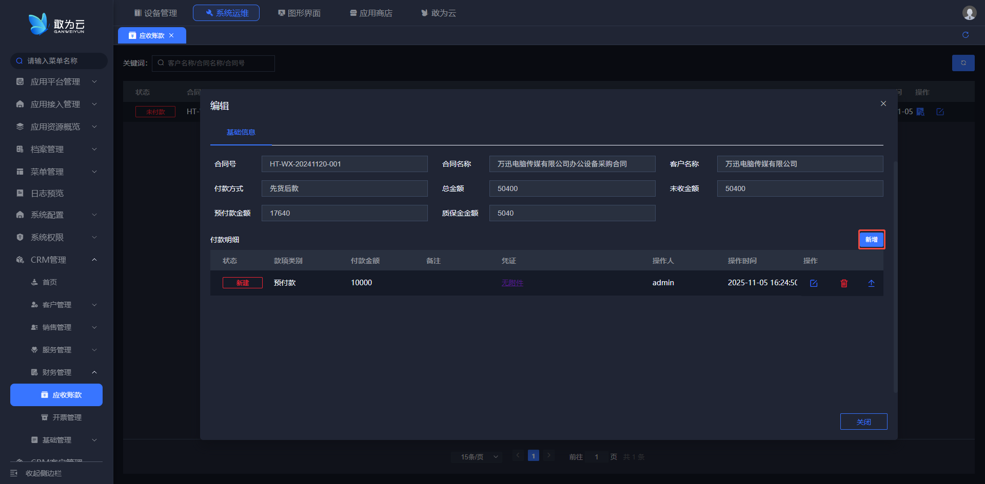- 点击该记录右侧的 「编辑」 按钮,系统会弹出与“新增”时相同的编辑表单;