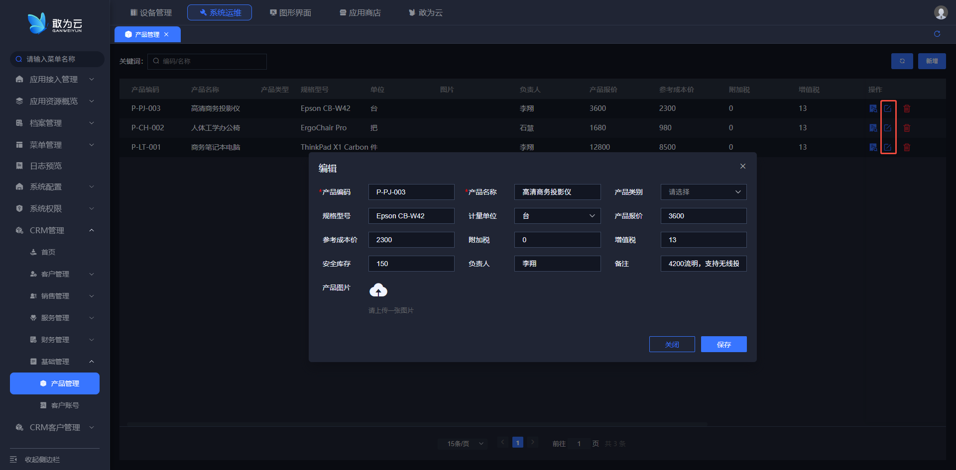- 点击该记录右侧的 「编辑」 按钮,打开产品编辑表单;