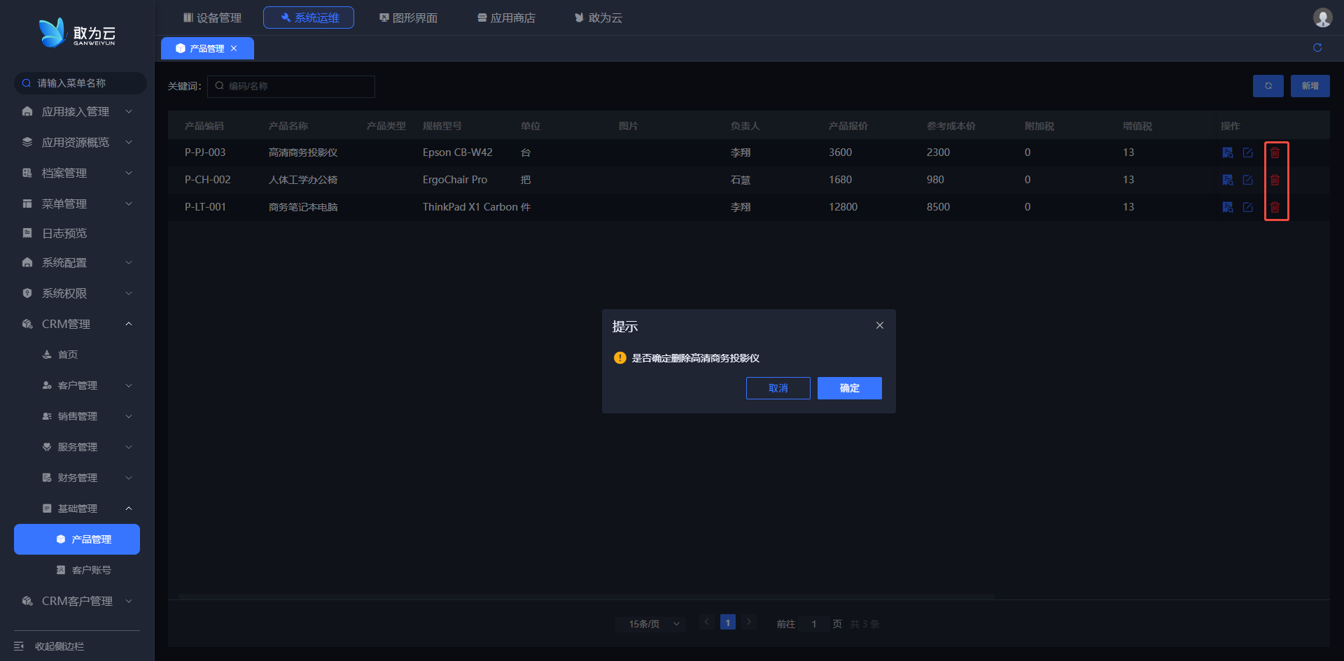 - 在 「产品管理」 列表中找到需要删除的产品记录;