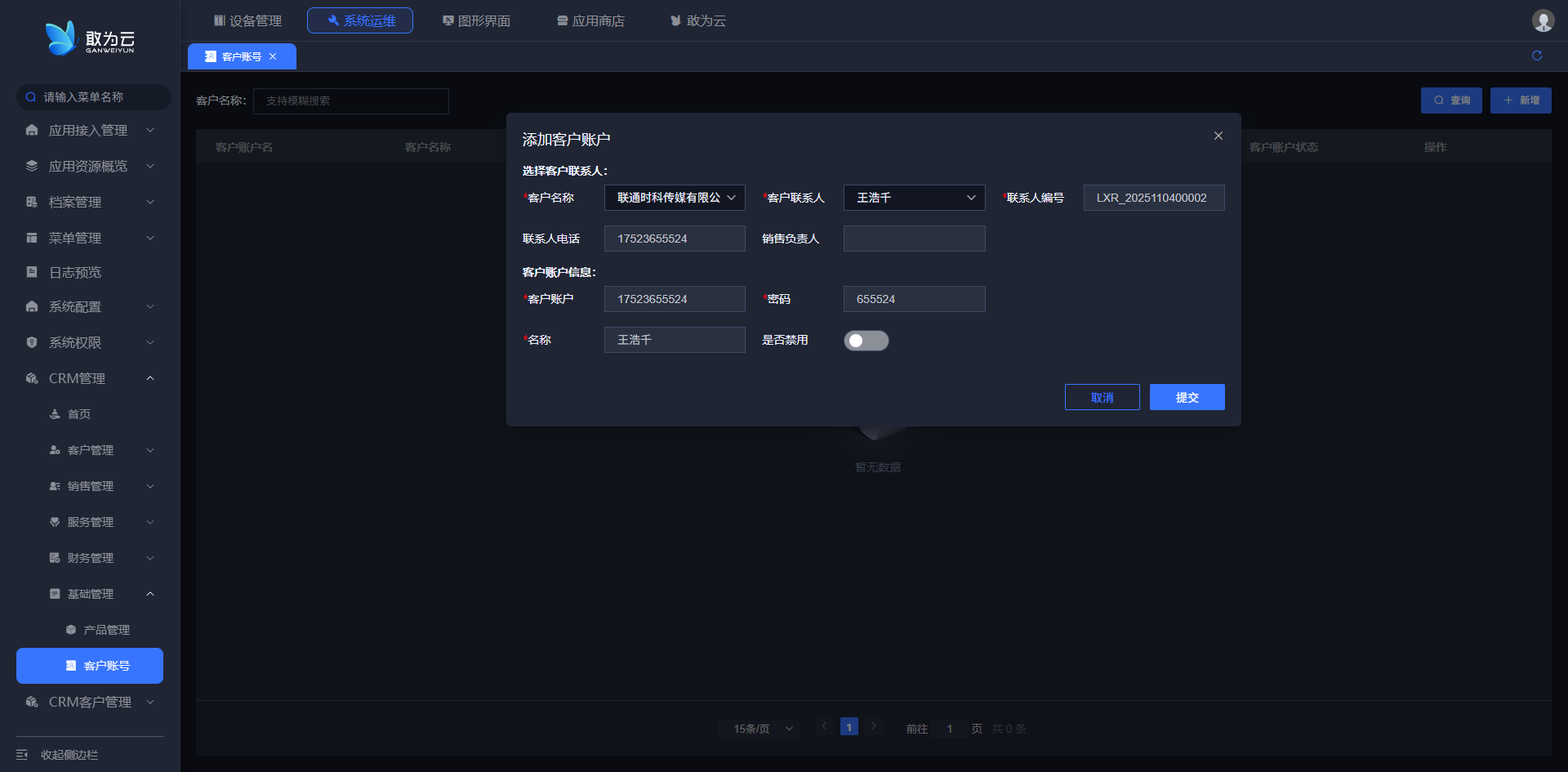 - 登录系统,进入 「客户账号」 管理页面;
