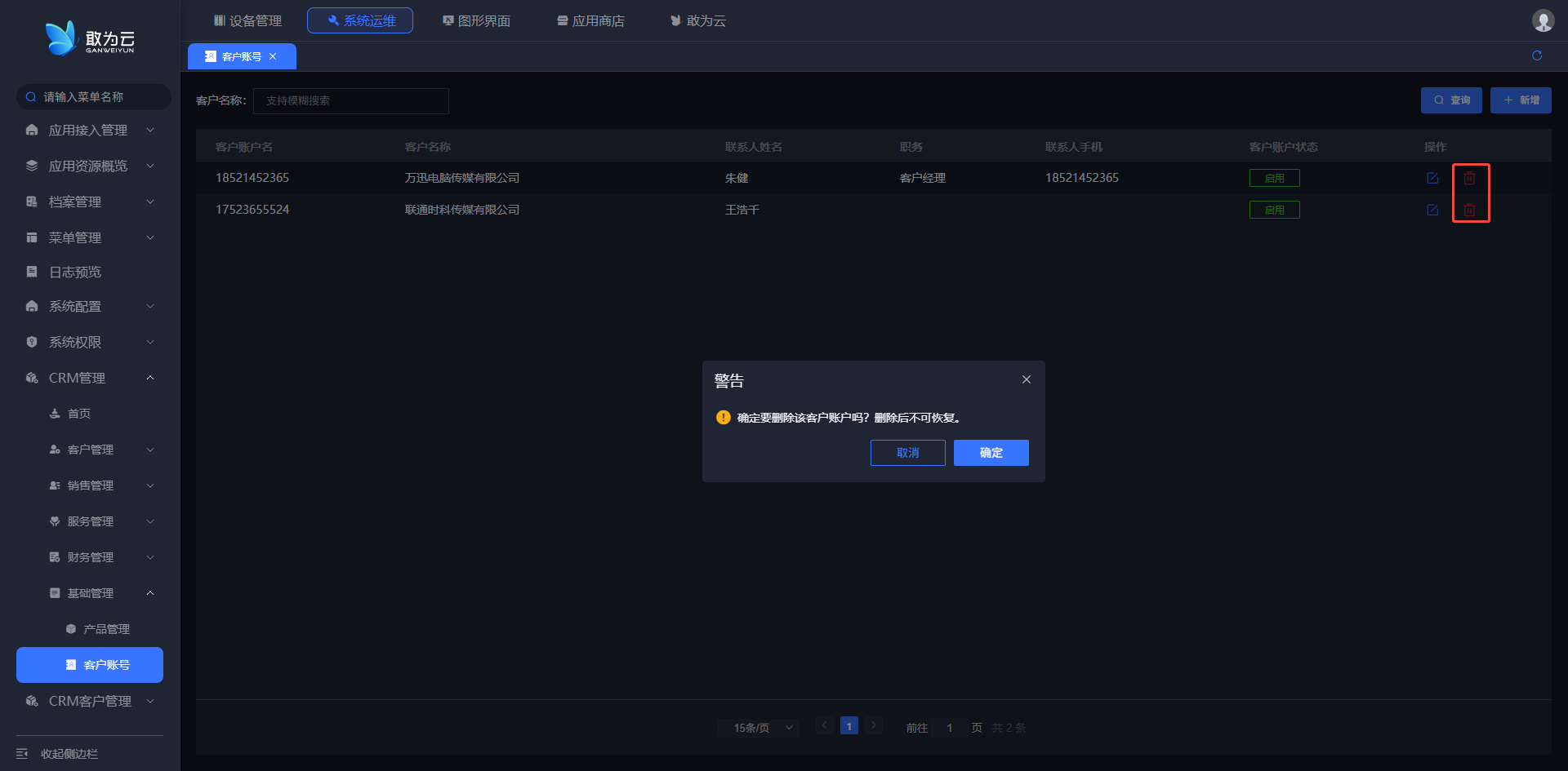 - 确认后,该客户账户将被永久删除。