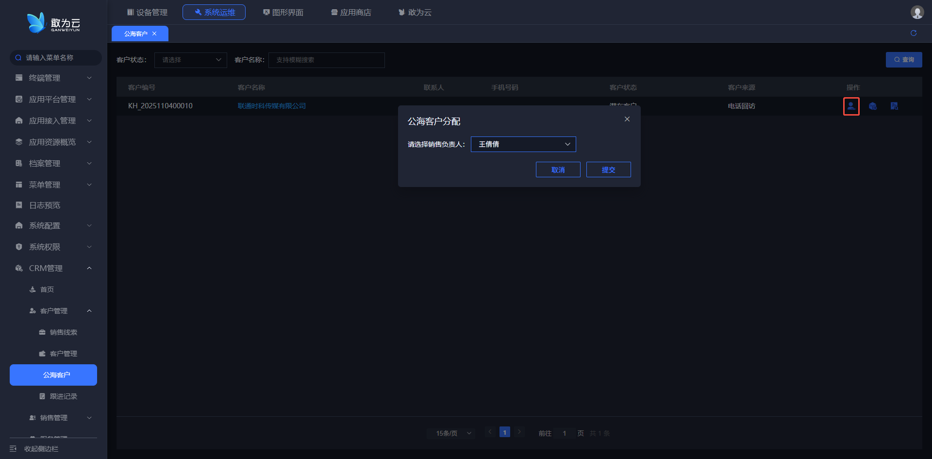 - 点击列表中的分配公海客户按钮