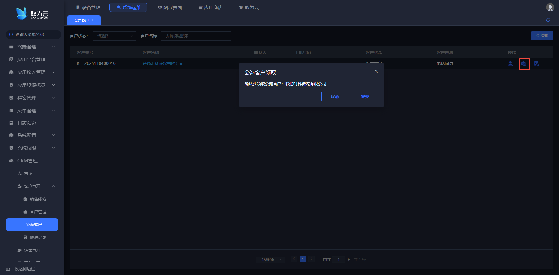 - 点击列表中的领取公海客户按钮