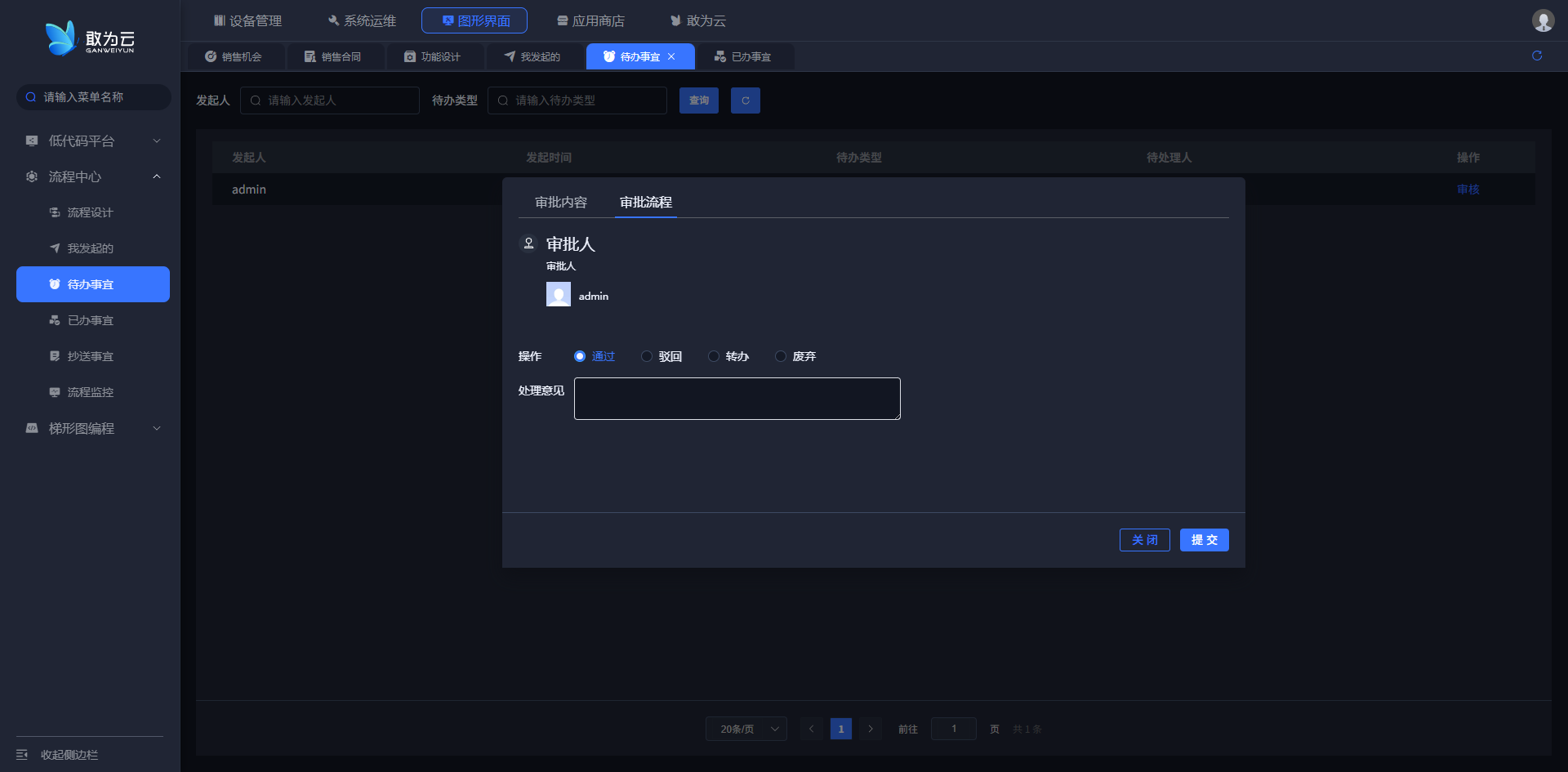 - 切换到对应的审批人账号,进入待办事宜可以对已经提交的审批单进行审批。