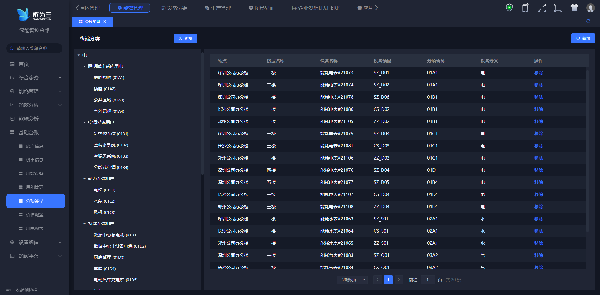- 分项类型选择:提供了不同的分项类型供用户选择,比如空调、照明、动力等。通过选择不同的分项类型,用户可以查看特定类型的能耗或设备信息。