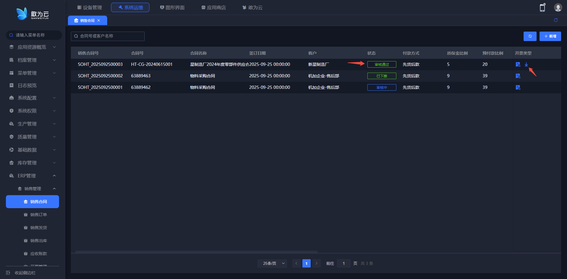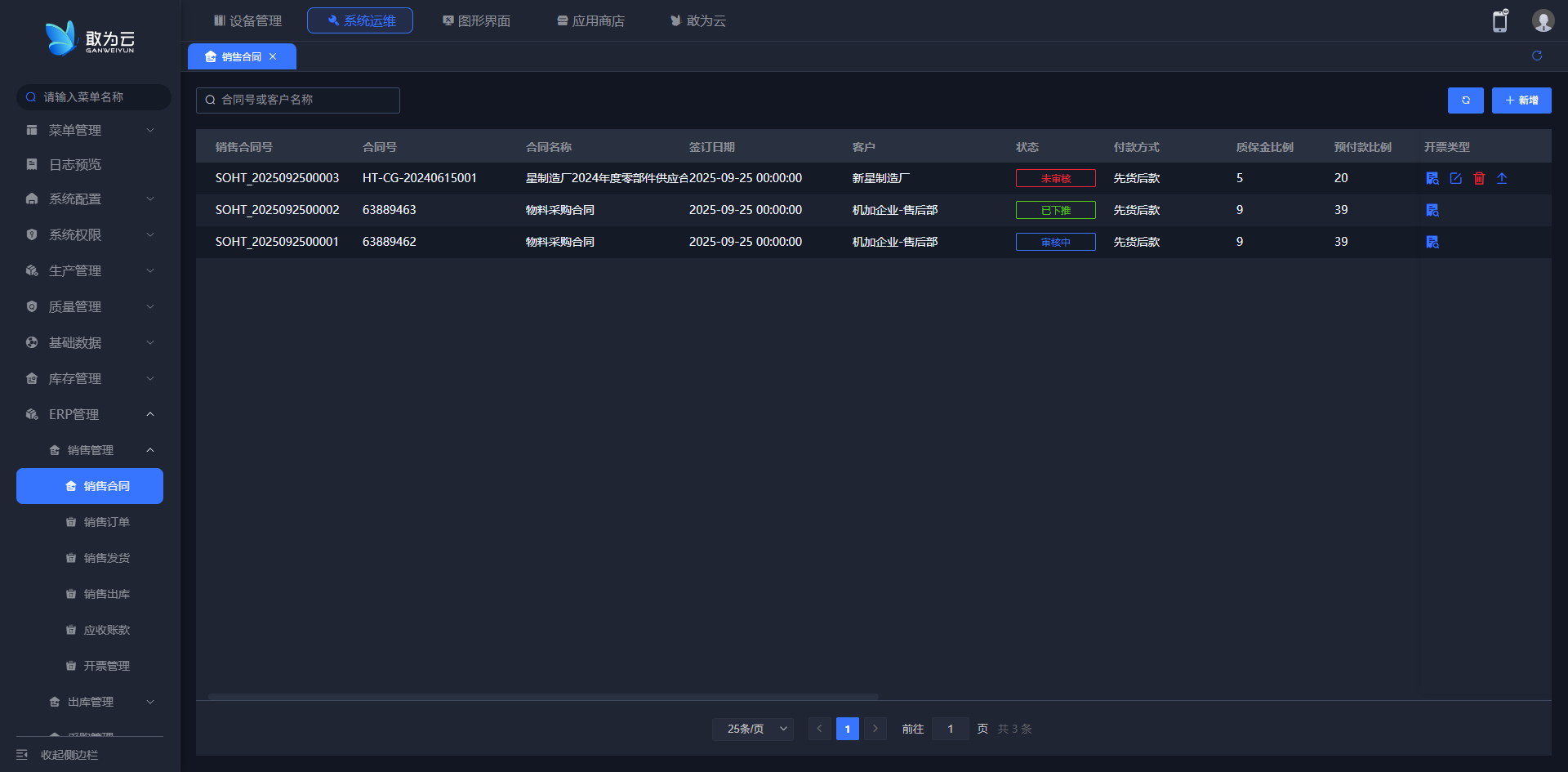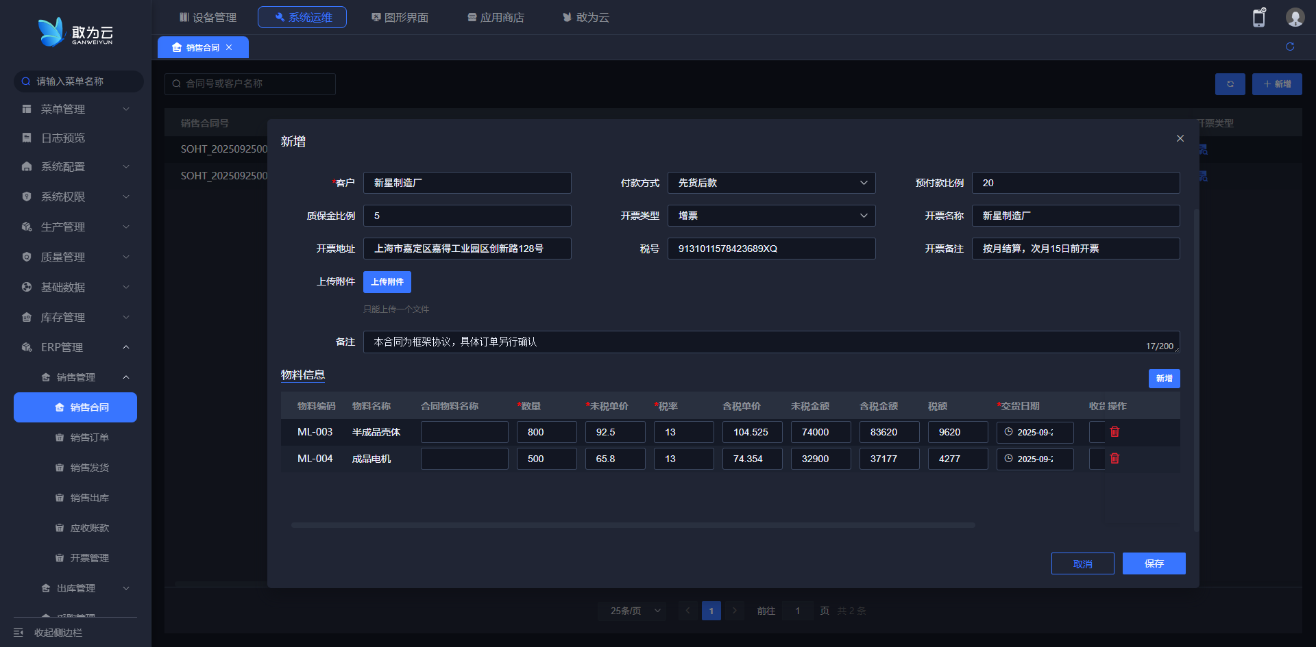 销售合同管理功能用于处理销售合同的创建、审批、变更及归档全流程,确保合同数据准确可追溯。