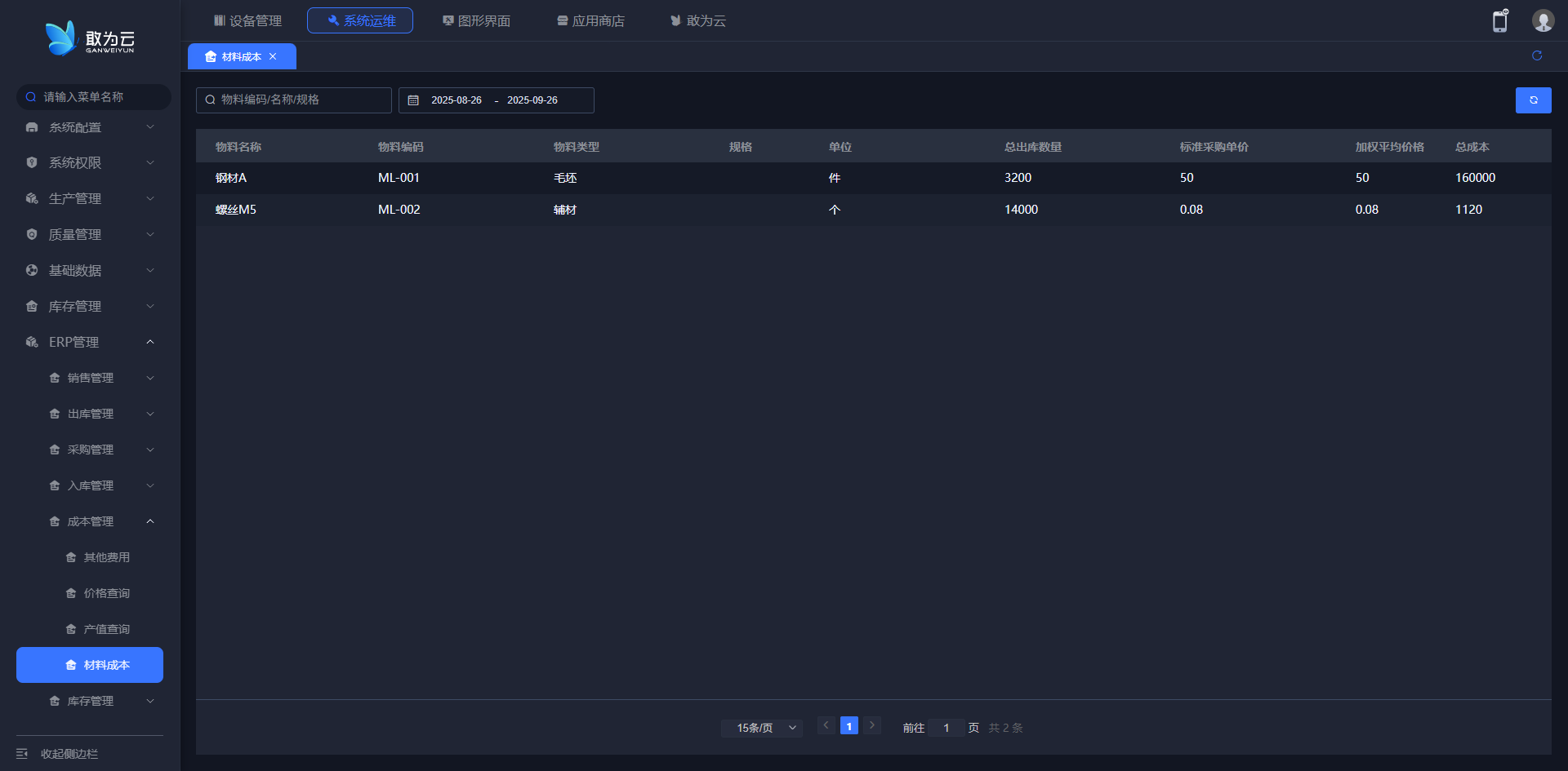 - 选择需要分析的物料或时间段,系统默认显示全部物料的材料成本。