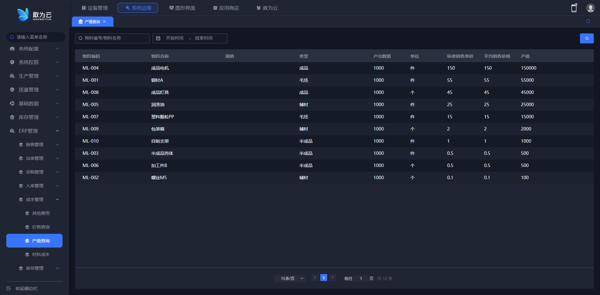产值查询功能统计生产部门产值及效率分析,用于绩效评估等其他用途。