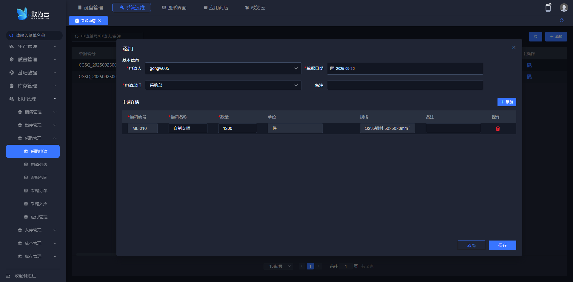 - 填写采购申请信息(物料名称、数量、需求日期等);
