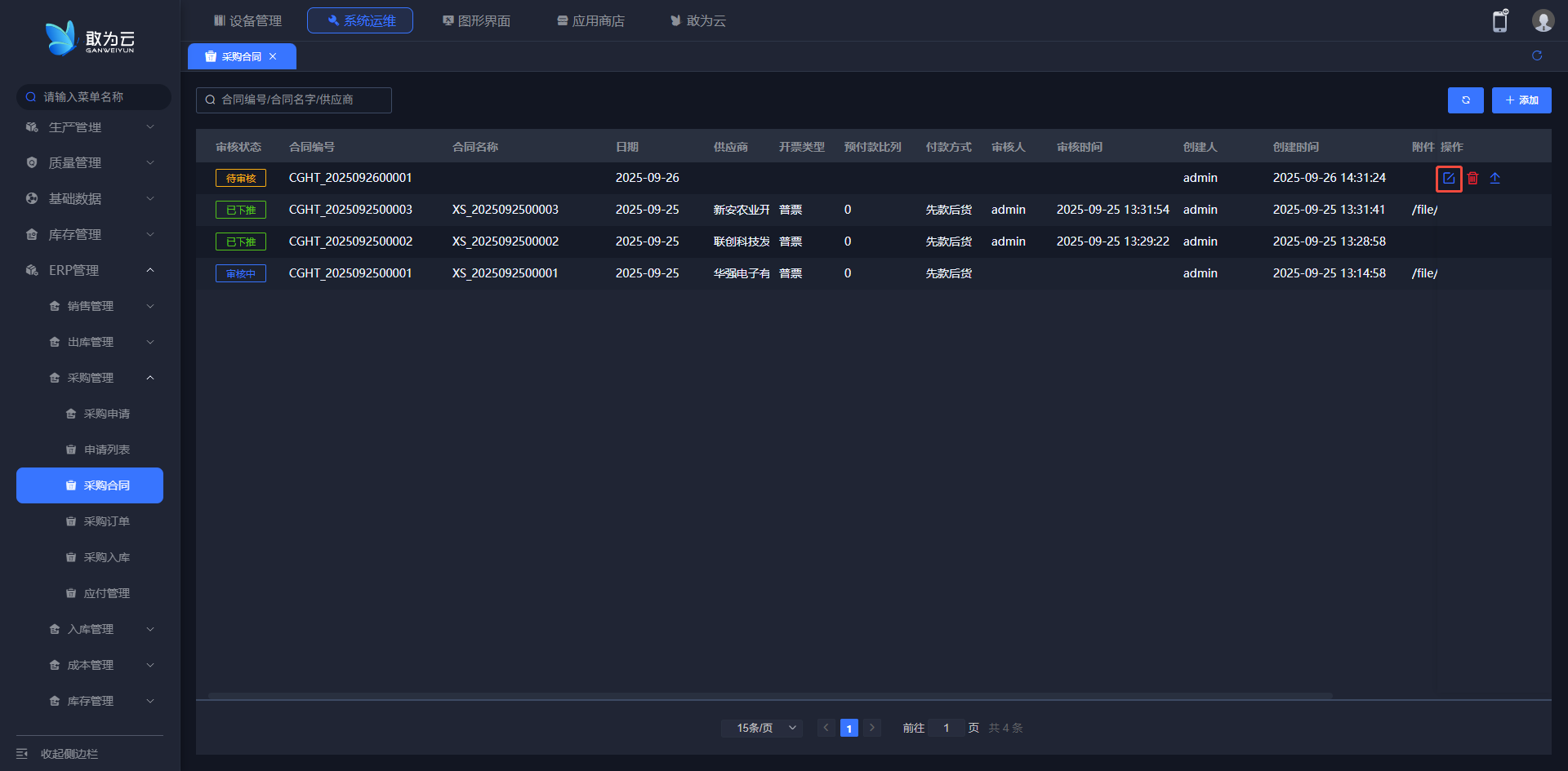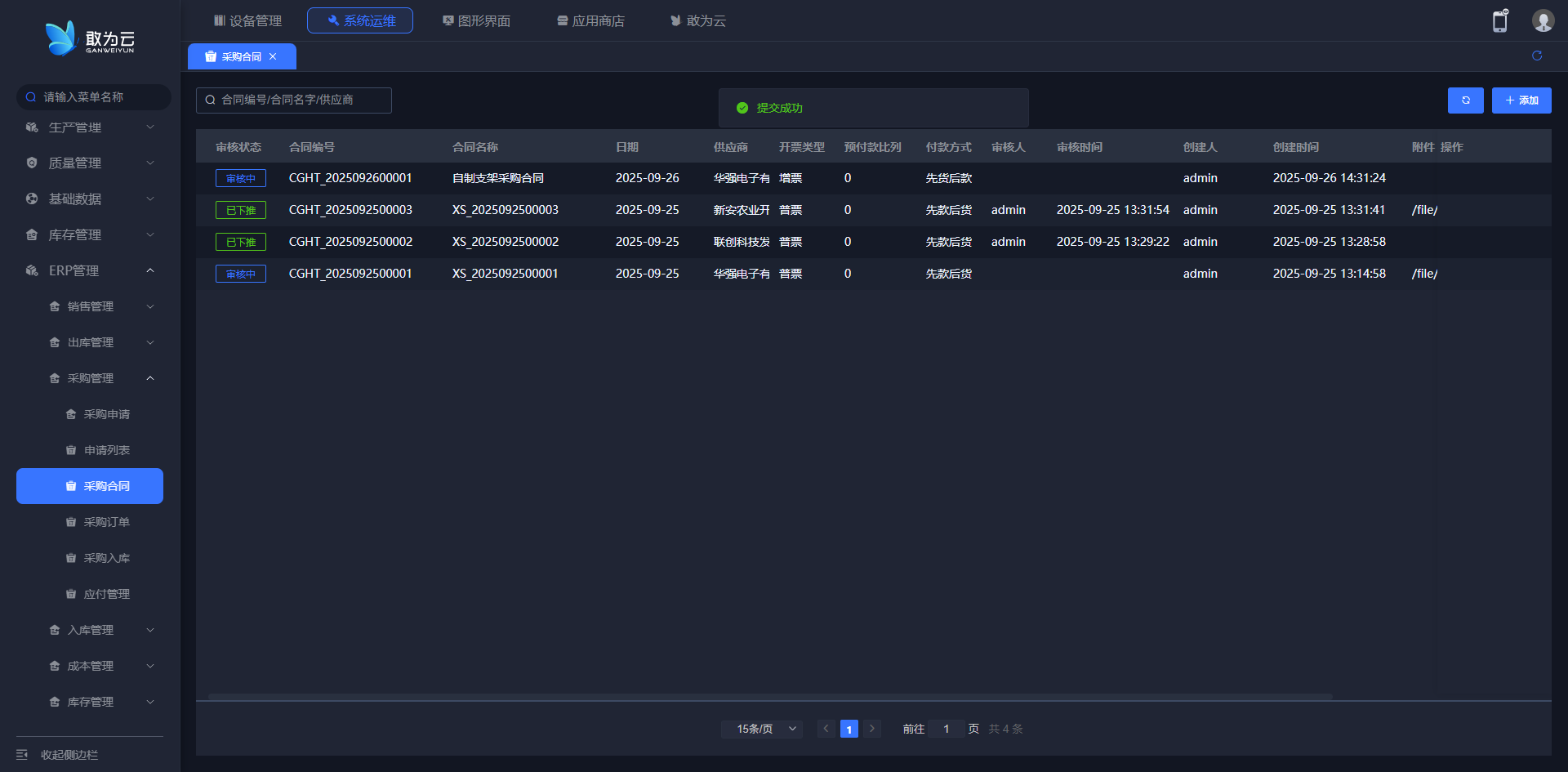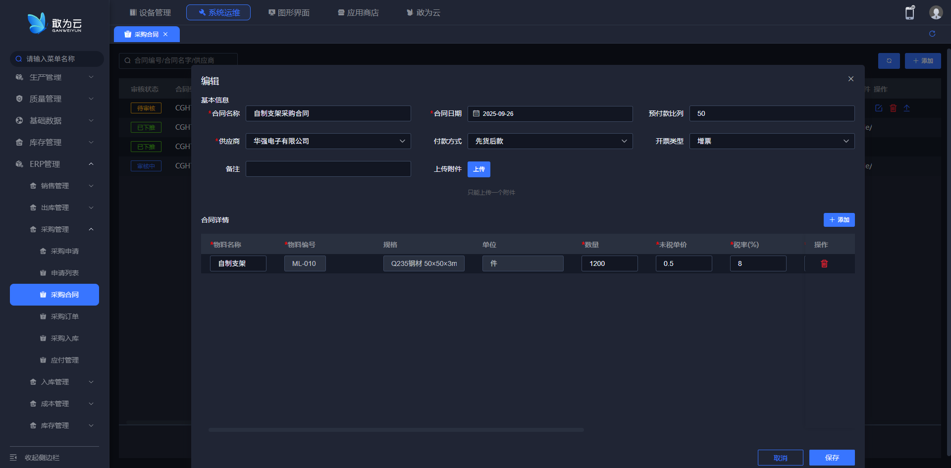 采购合同功能用于创建和管理采购相关的合同,确保合同条款清晰可查。