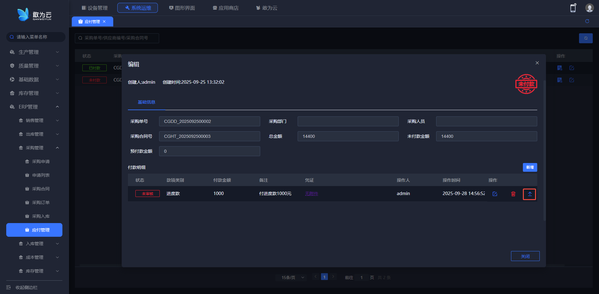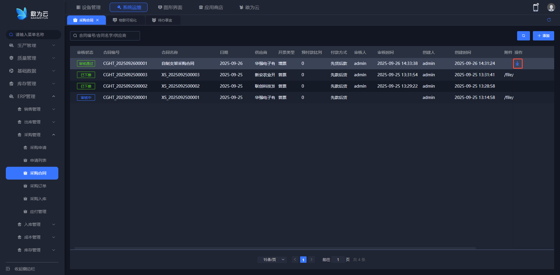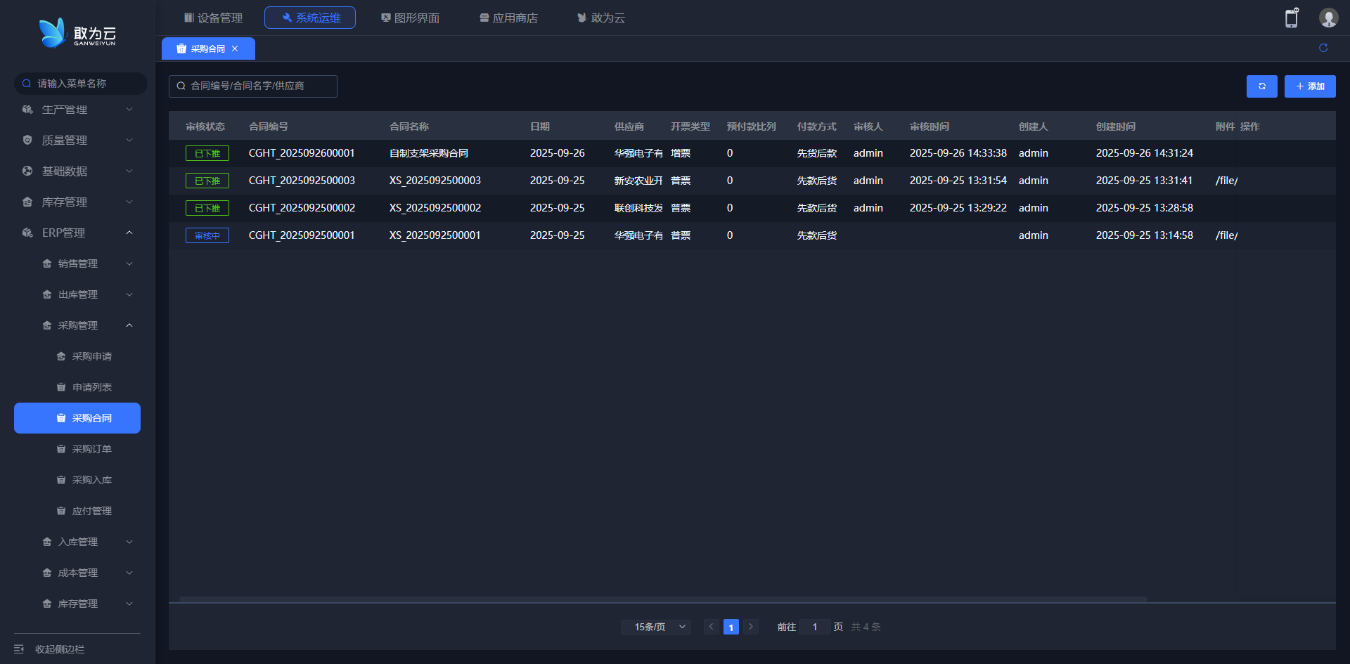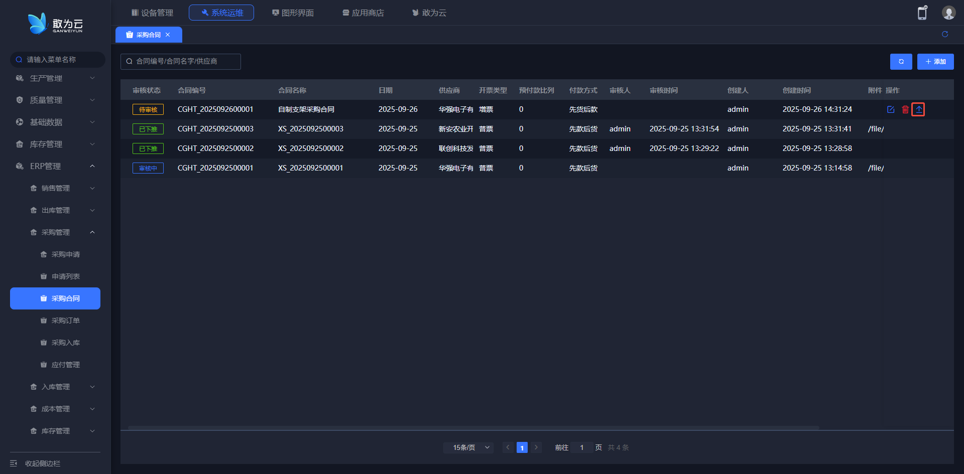 采购合同功能用于创建和管理采购相关的合同,确保合同条款清晰可查。