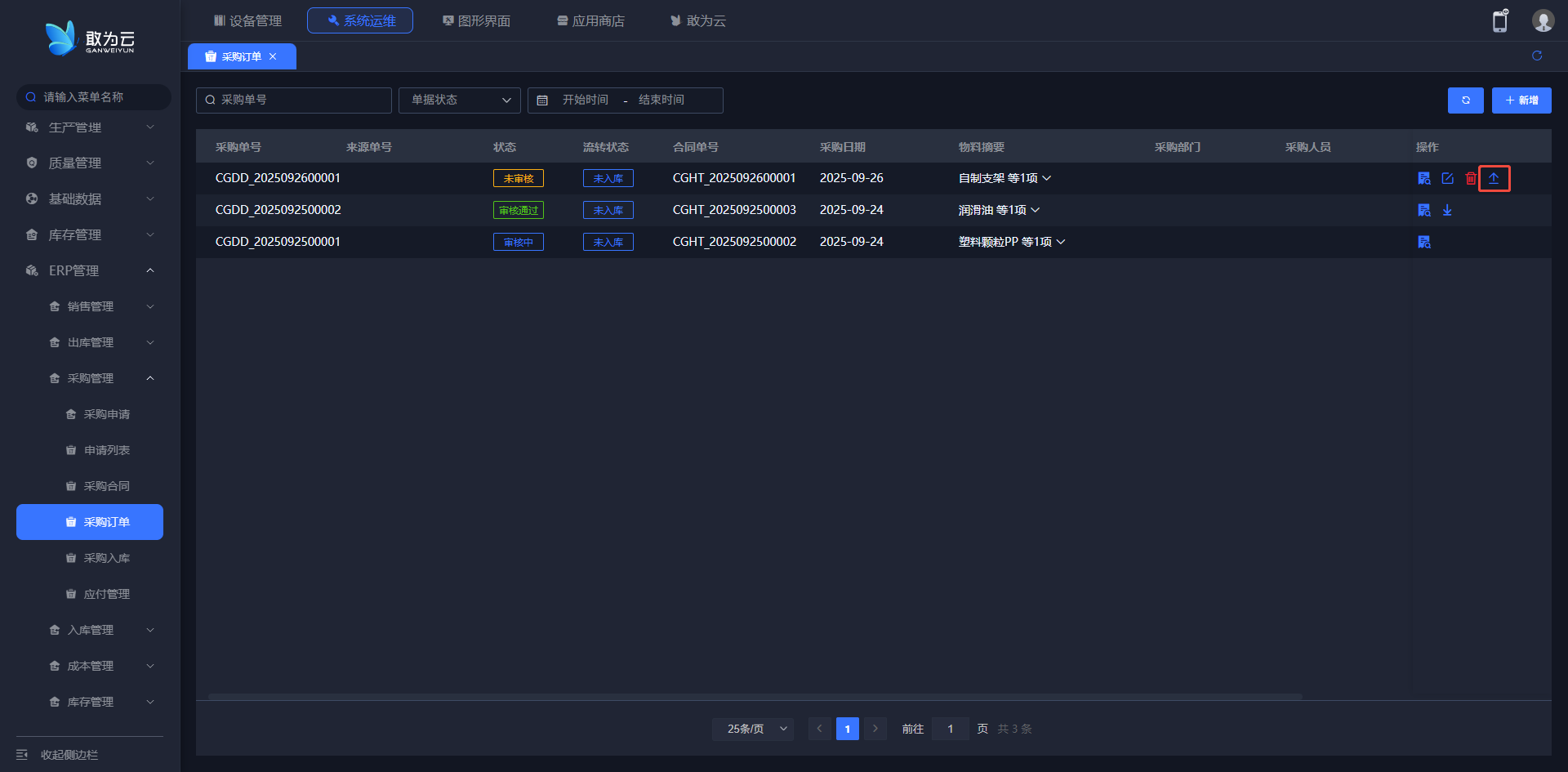 采购订单功能用于生成和管理采购订单,跟踪订单执行情况。