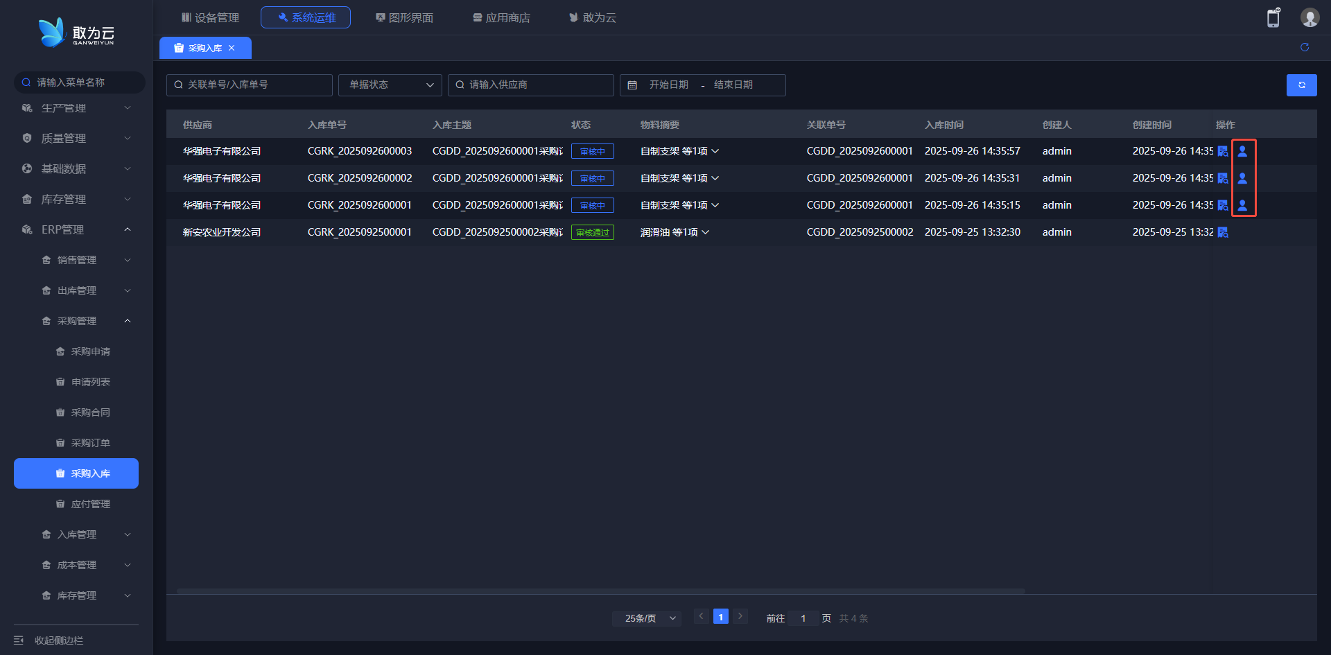 - 提交采购入库单进行审核;审核通过后完成入库操作。