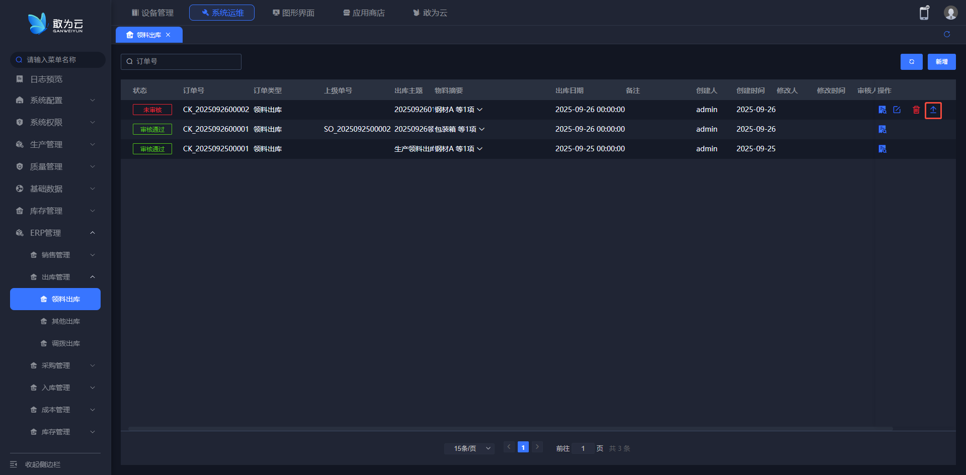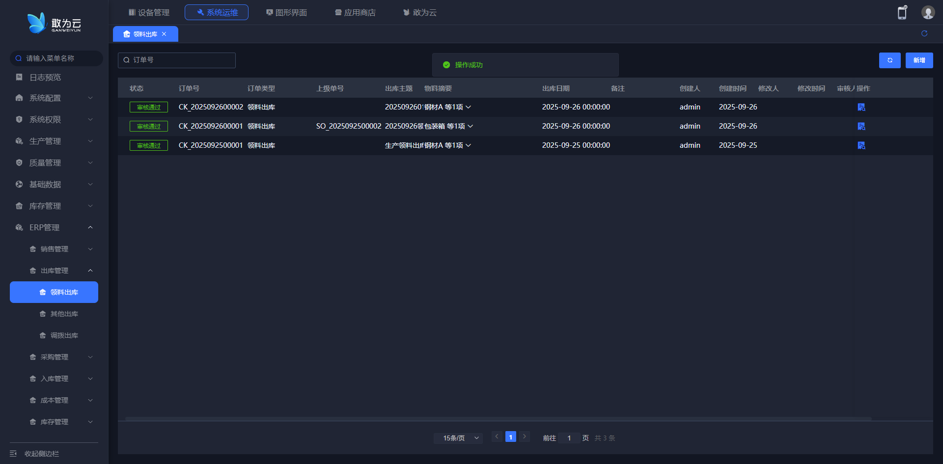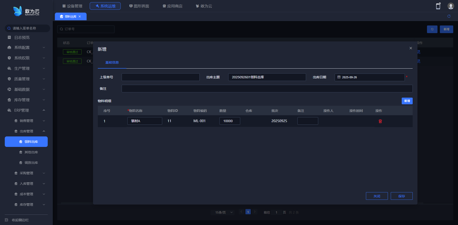 领料出库功能管理生产领料流程和物料消耗跟踪,支持生产成本核算。